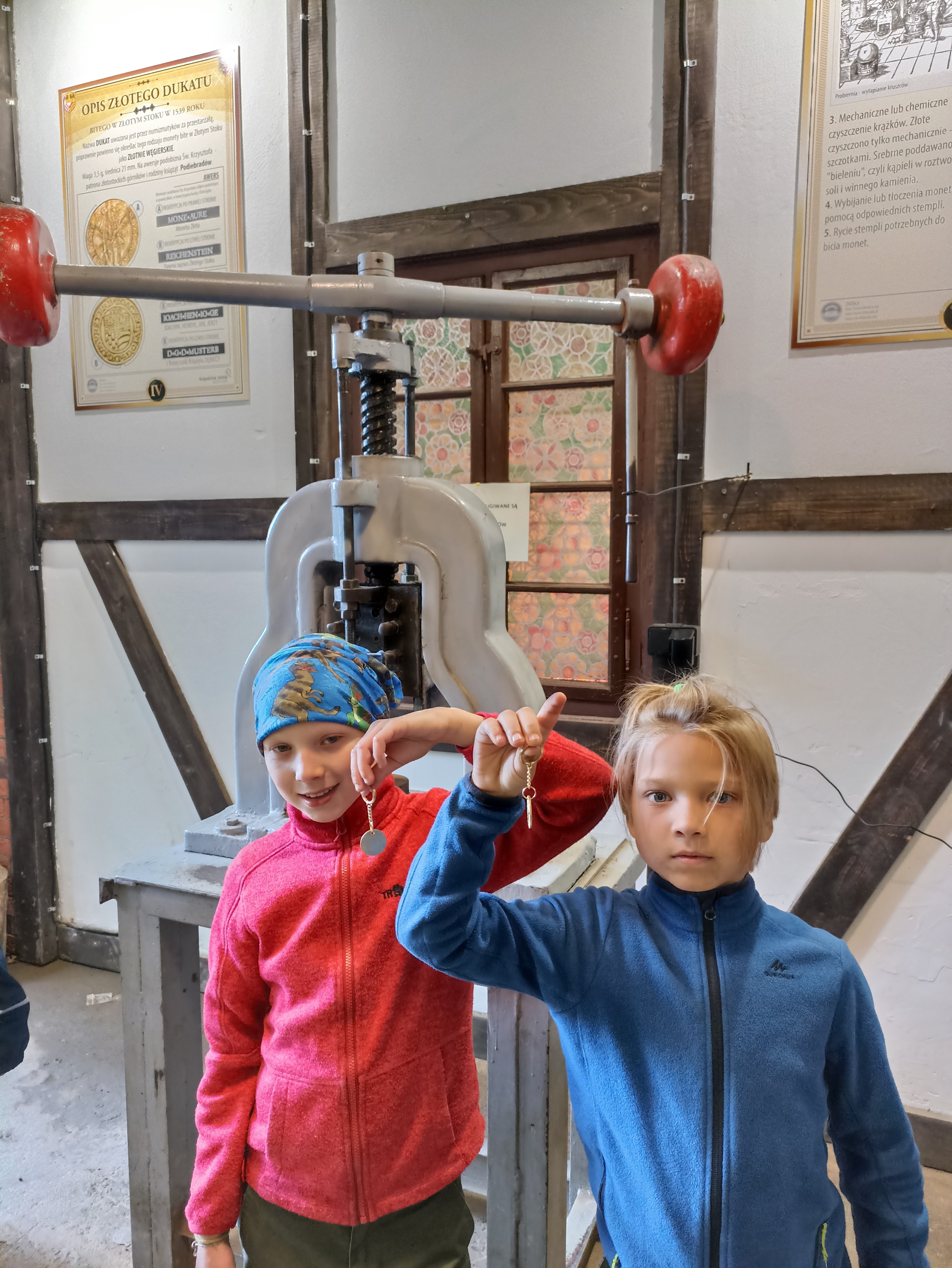 Mieliśmy również okazje przejechać się podziemną kolejką (podobną jak w całkiem nieodległych czasach przemieszczali się górnicy). Było to dość traumatyczne przeżycie – huk był niesamowity! Wybiliśmy sobie po pamiątkowej monecie, wzorowanej na oryginalnym złotym dukacie bitym w mennicy w Złotym Stoku. Niestety sama kopalnia już nie działa, więc nie mamy więcej zdobyczy.