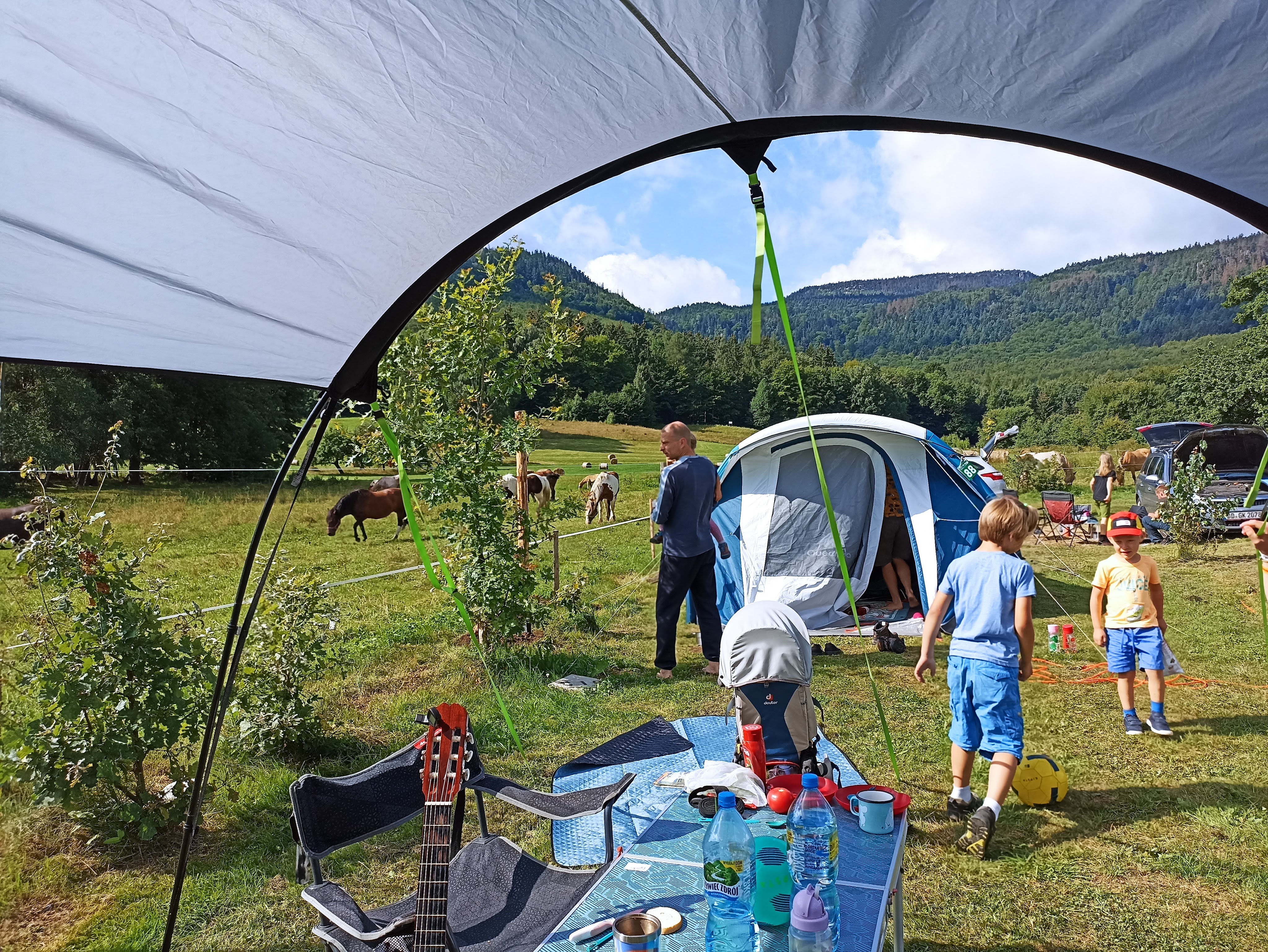 Oto jaki widok obudził w sobotę rano. Kemping Camper Park mimo, że nie za duży i dosyć pełny (przyjechaliśmy akurat na weekend) okazał się być na prawdę bajecznie położony. Otoczony z każdej strony zalesionymi górami z doskonale widocznym Szczelińcem Wielkim. Z terenem kempingu z jednej strony graniczą pastwiska (a 200m dalej zaczyna się Park Narodowy Gór Stołowych), zaś z drugiej stawy hodowlane pełne pstrągów oraz restauracja serwująca dania rybne i lokalne. Zaraz restauracją zaczyna się Zalew Radkowski z rozległymi terenami rekreacyjnymi – plaża, place zabaw, ścieżki rowerowe i spacerowe itp.