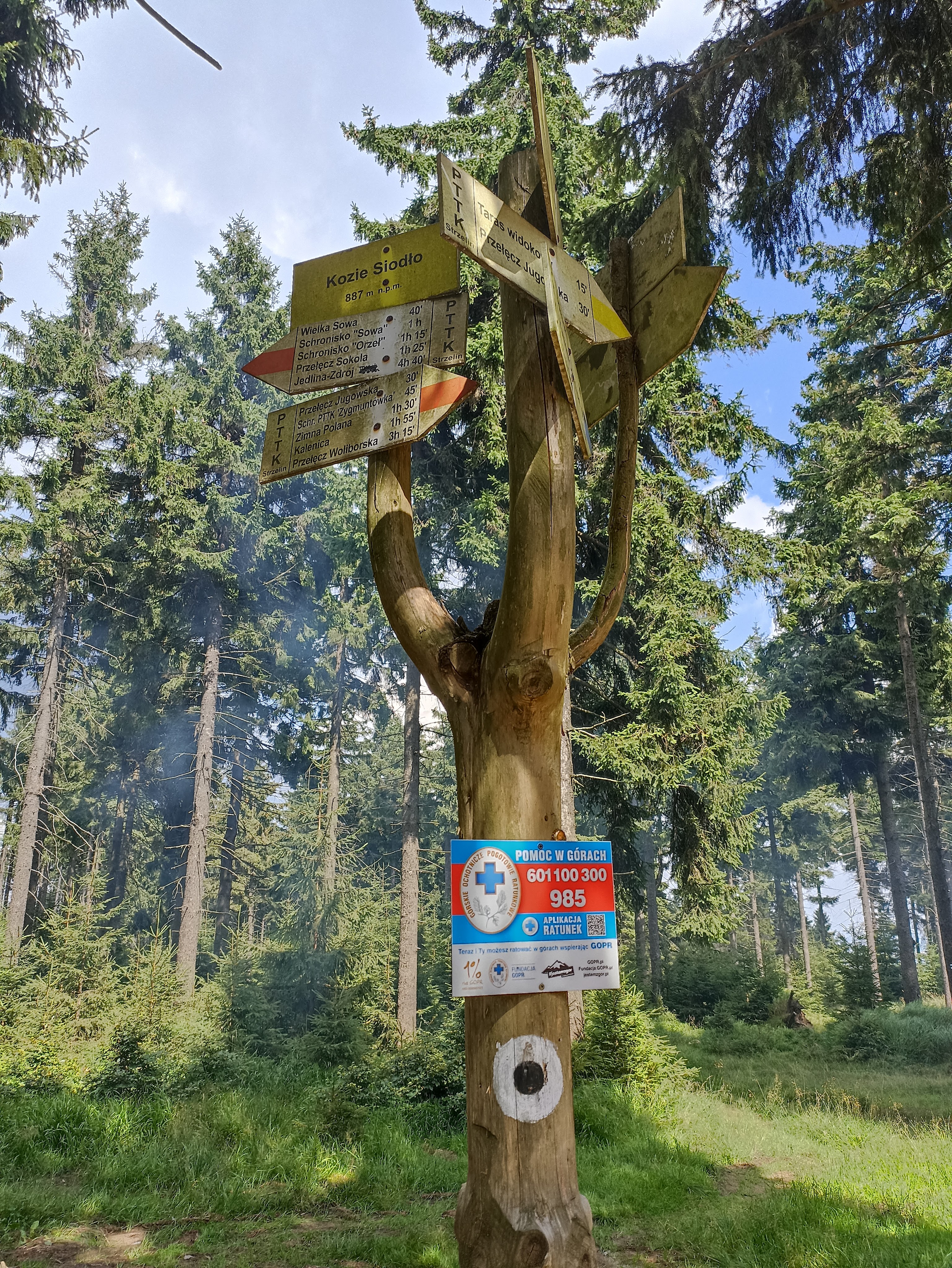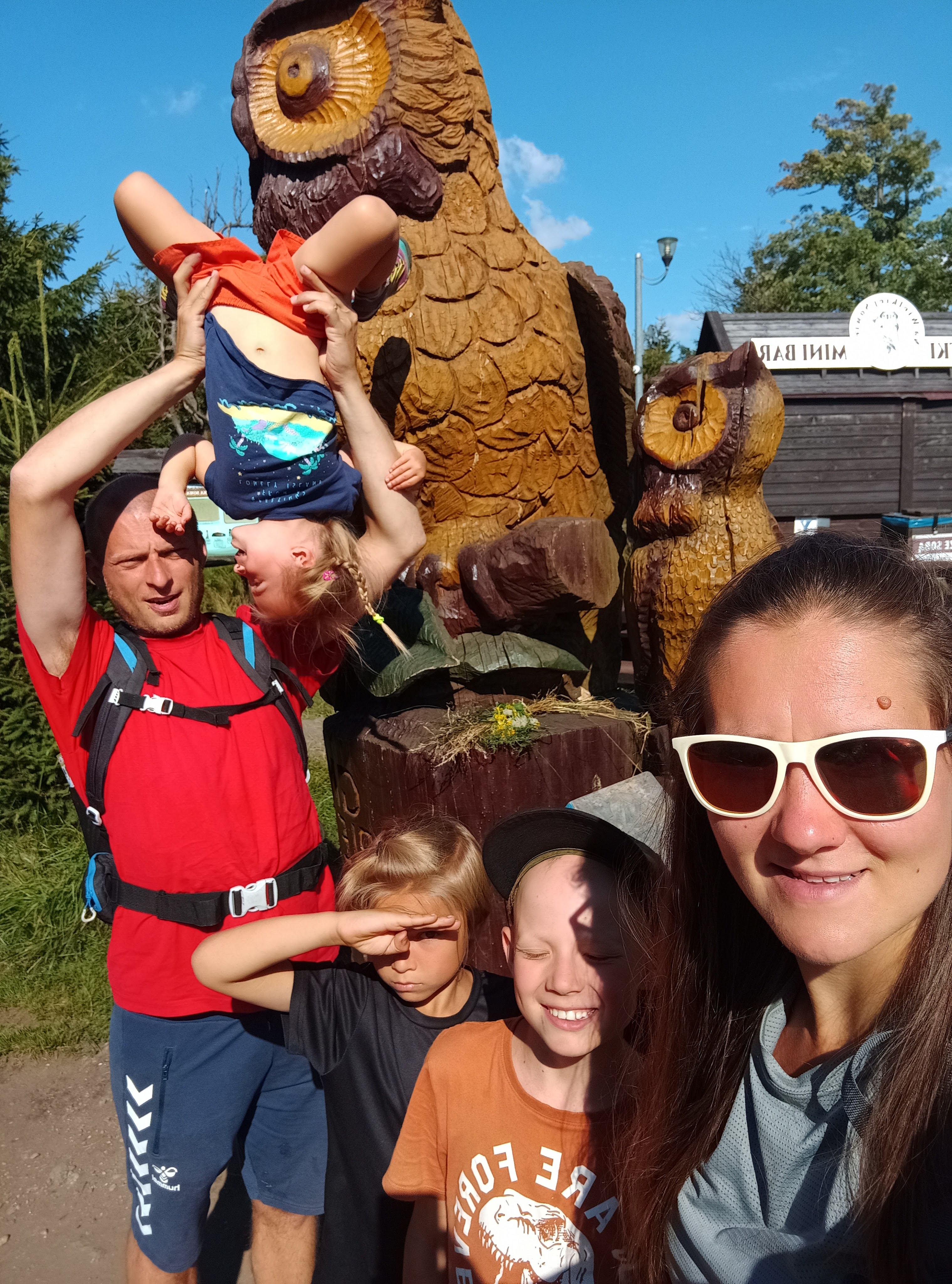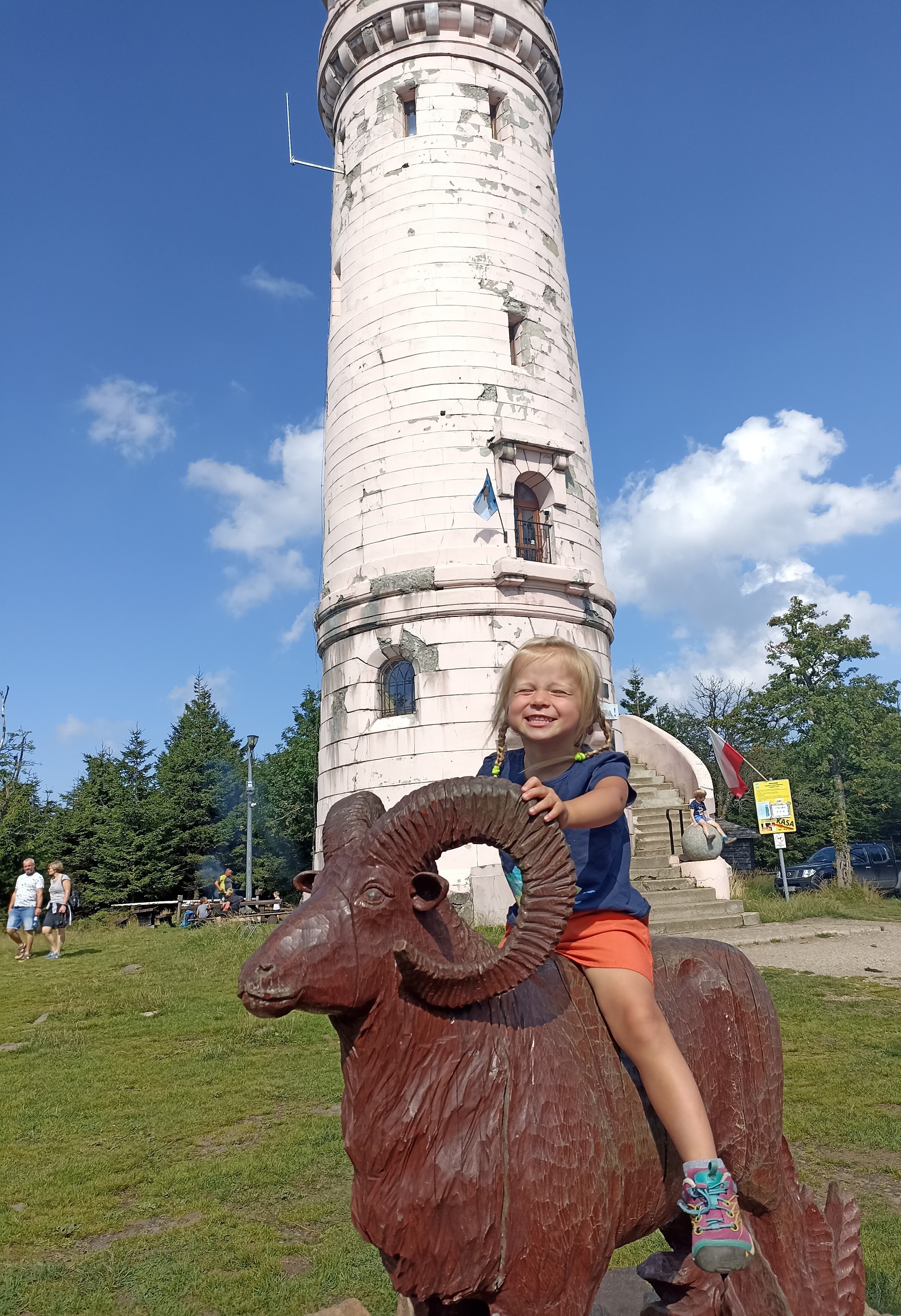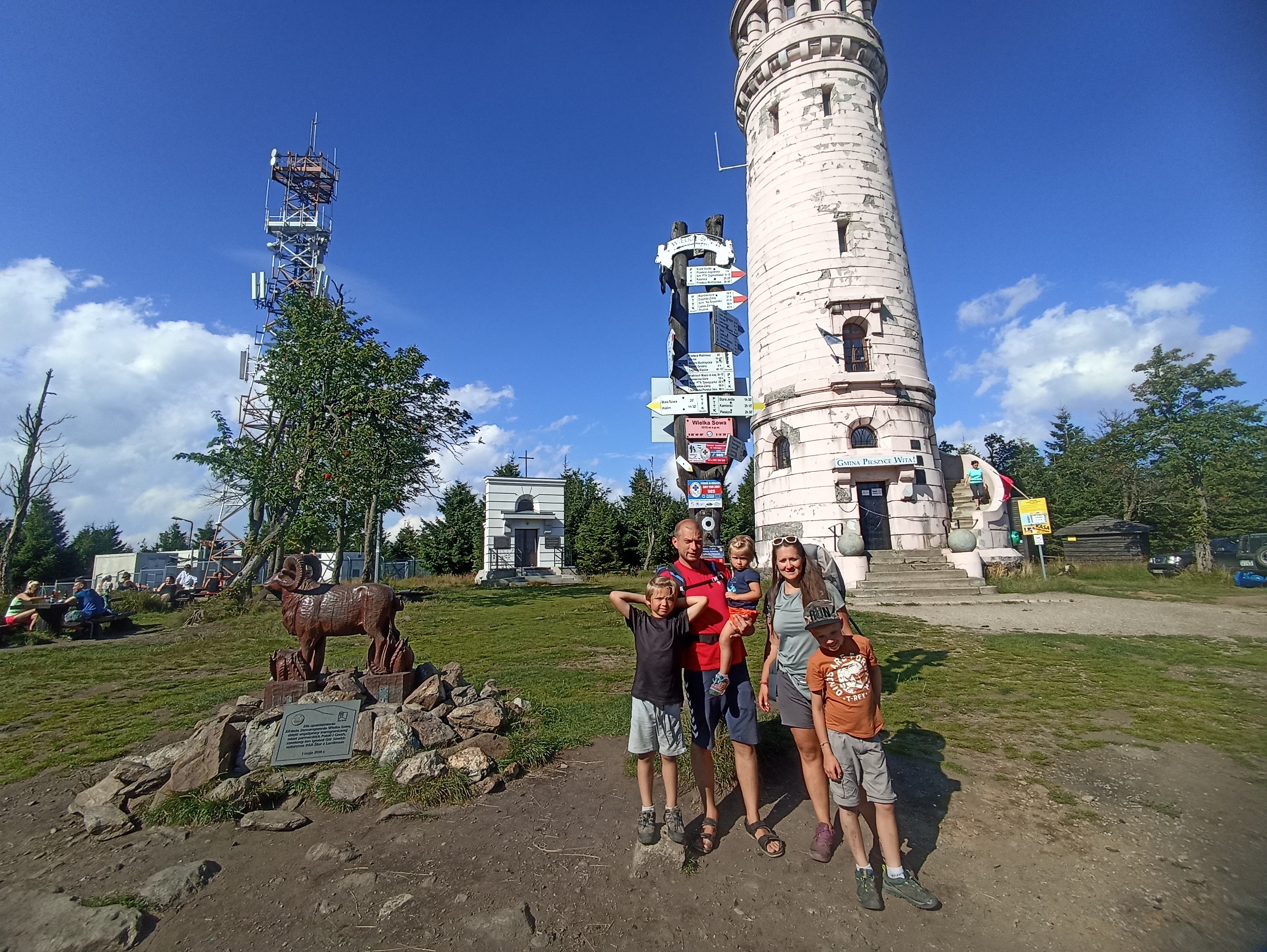 Na szczyt docieramy niecałych 3 godzinach. Na górze wita nas duży drewniany pomnik sowy, symbolu Gór Sowich, murowana wieża widokowa i ognisko z kiełbaskami. Oczywiście zaczynamy od kiełbasek! 😉 Na szczęście nie jest tu tak tłoczno jak na Szczelińcu Wielkim. Może to kwestia godziny – jak tu docieramy jest już 15:00, czyli już raczej po górskich godzinach nomen omen szczytu. Też jest to zdecydowanie więcej przestrzeni niż na ciasnych tarasach skalistego Szczelińca. Są wiaty, ławy – każdy znajdzie dla siebie miejsce. Znajduję się tu też barek, w którym można zaopatrzyć się w kiełbaskę na ognisko, pamiątki, napoje i jakieś przekąski.