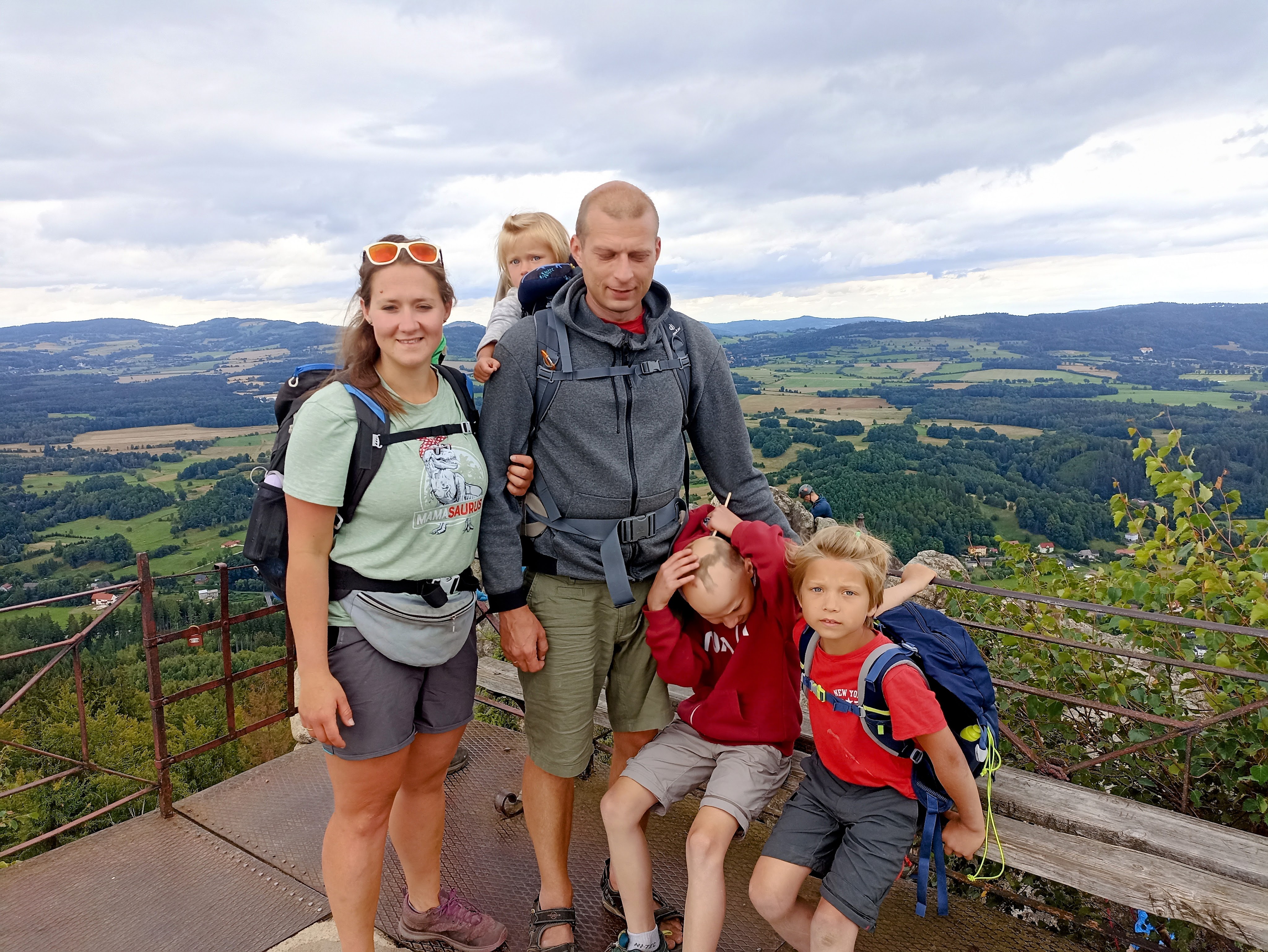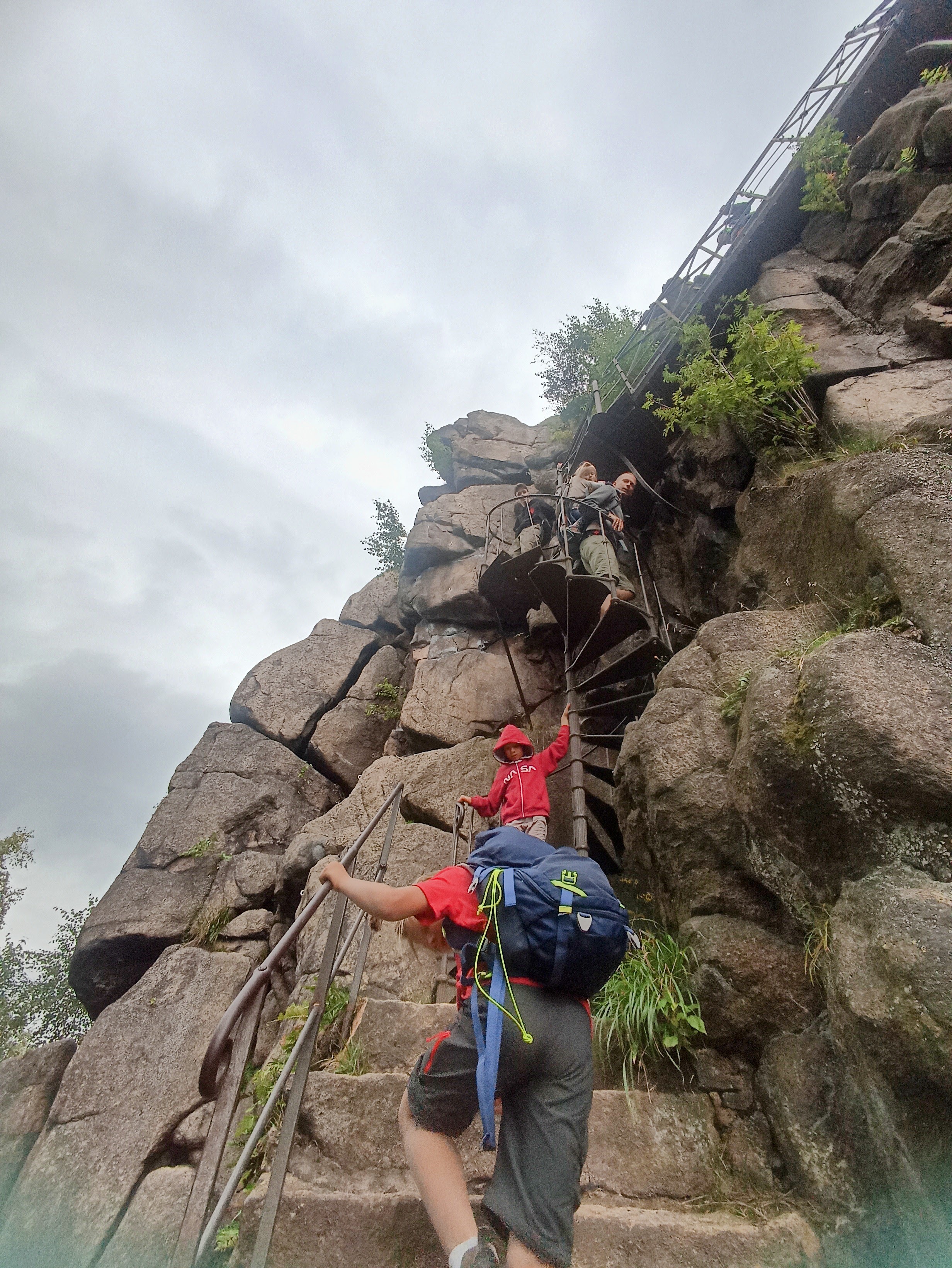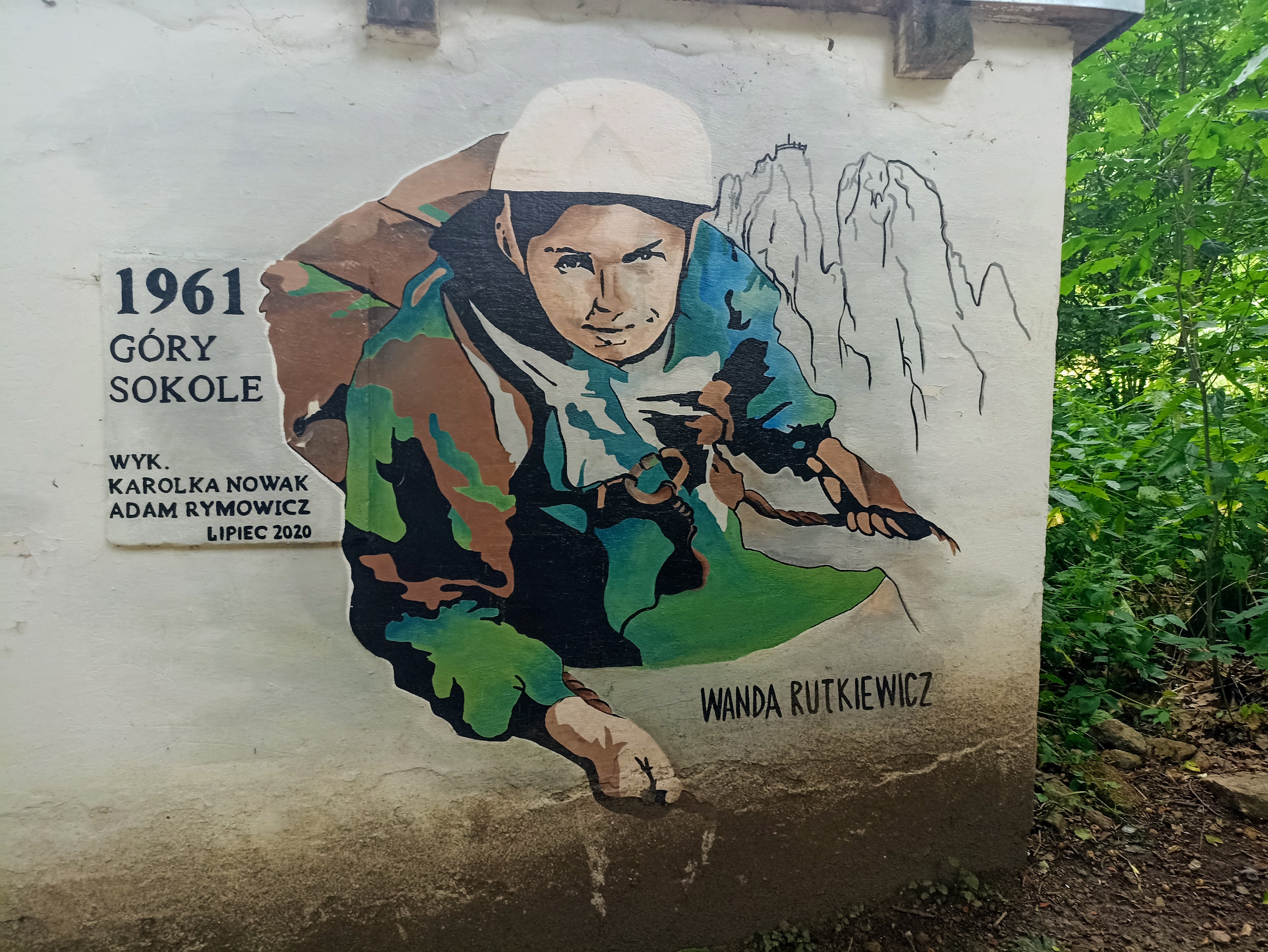 Po drodze napotkaliśmy mural z Wandą Rutkiewicz i datą 1961. Okazuje się bowiem, że ta słynna polska himalaistka pierwsze górskie kroki stawiała właśnie w Górach Sokolich. Kto wie może i my za kilka (kilkanaście) lat zmierzymy się ze znacznie wyższymi szczytami? Chłopcy już od kilku dni snują rozmyślania, czy po zdobyciu Korony Gór Polskich obiorą za cel słynny Mount Everest, czy mniej dostępne K2.