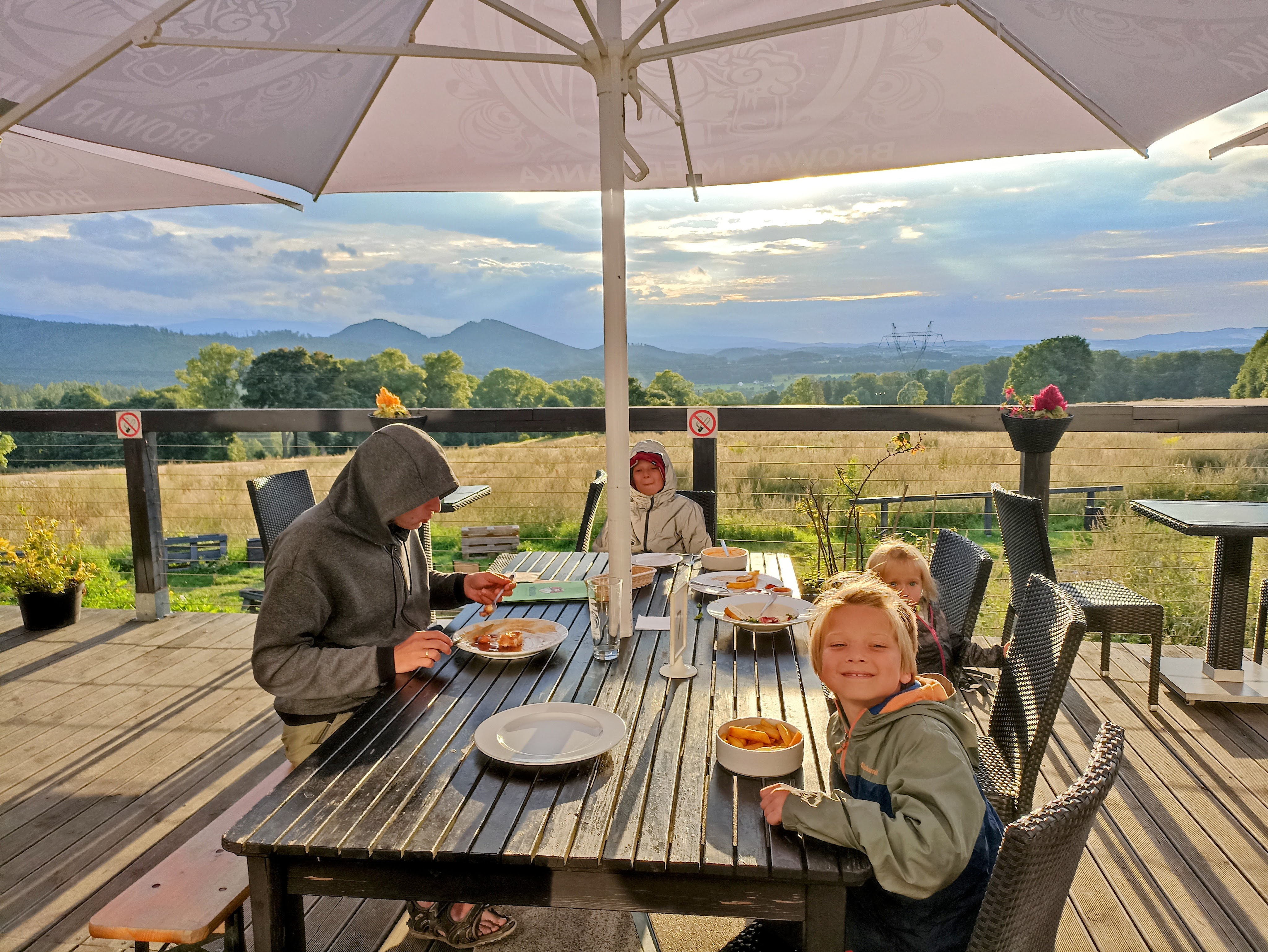Wracając na kemping zatrzymaliśmy się na obiad numer 2 😉 w Browarze Miedzianka, aby skosztować lokalnych dań i napatrzeć się na wspaniały widok na okoliczne góry.