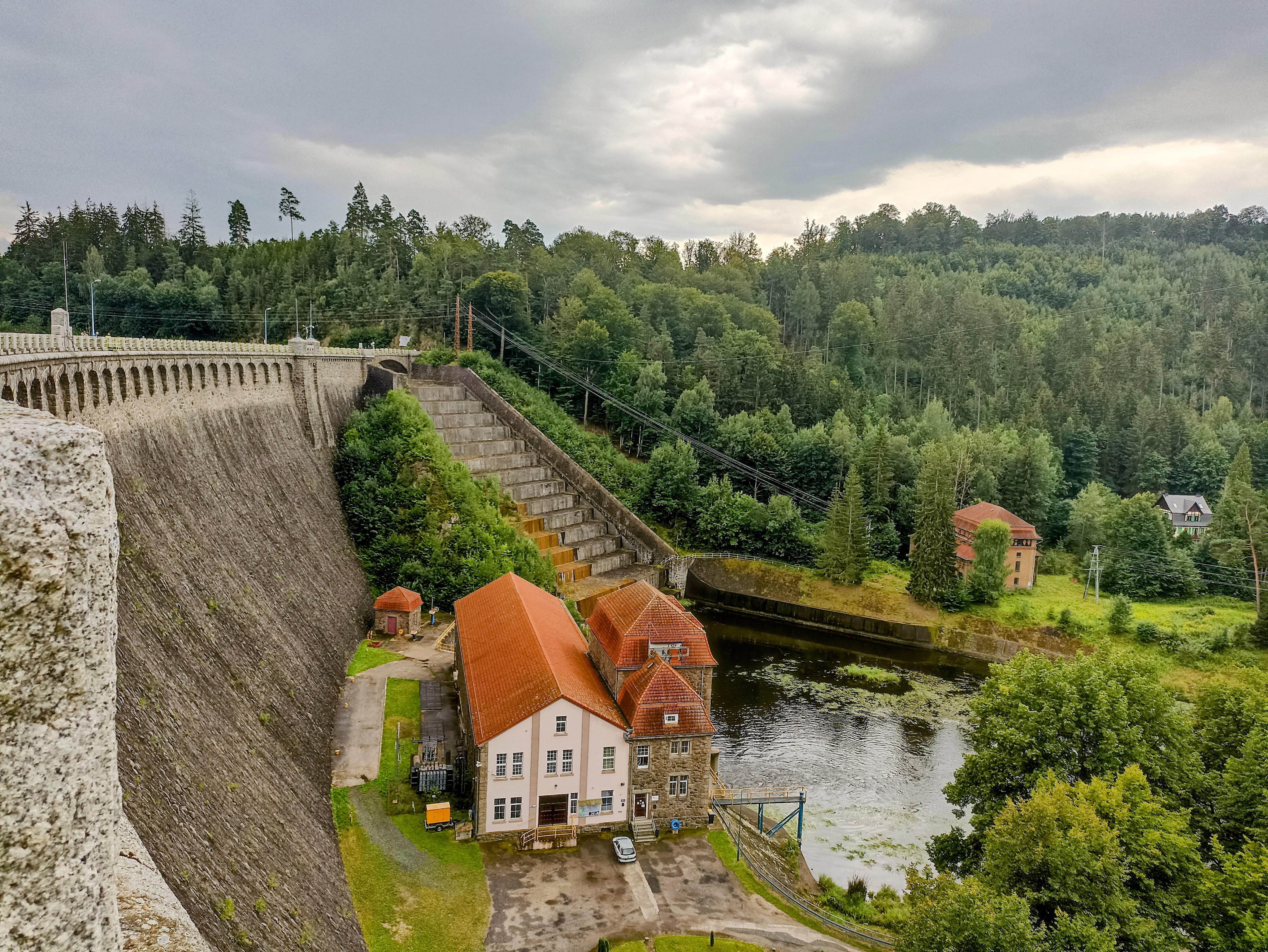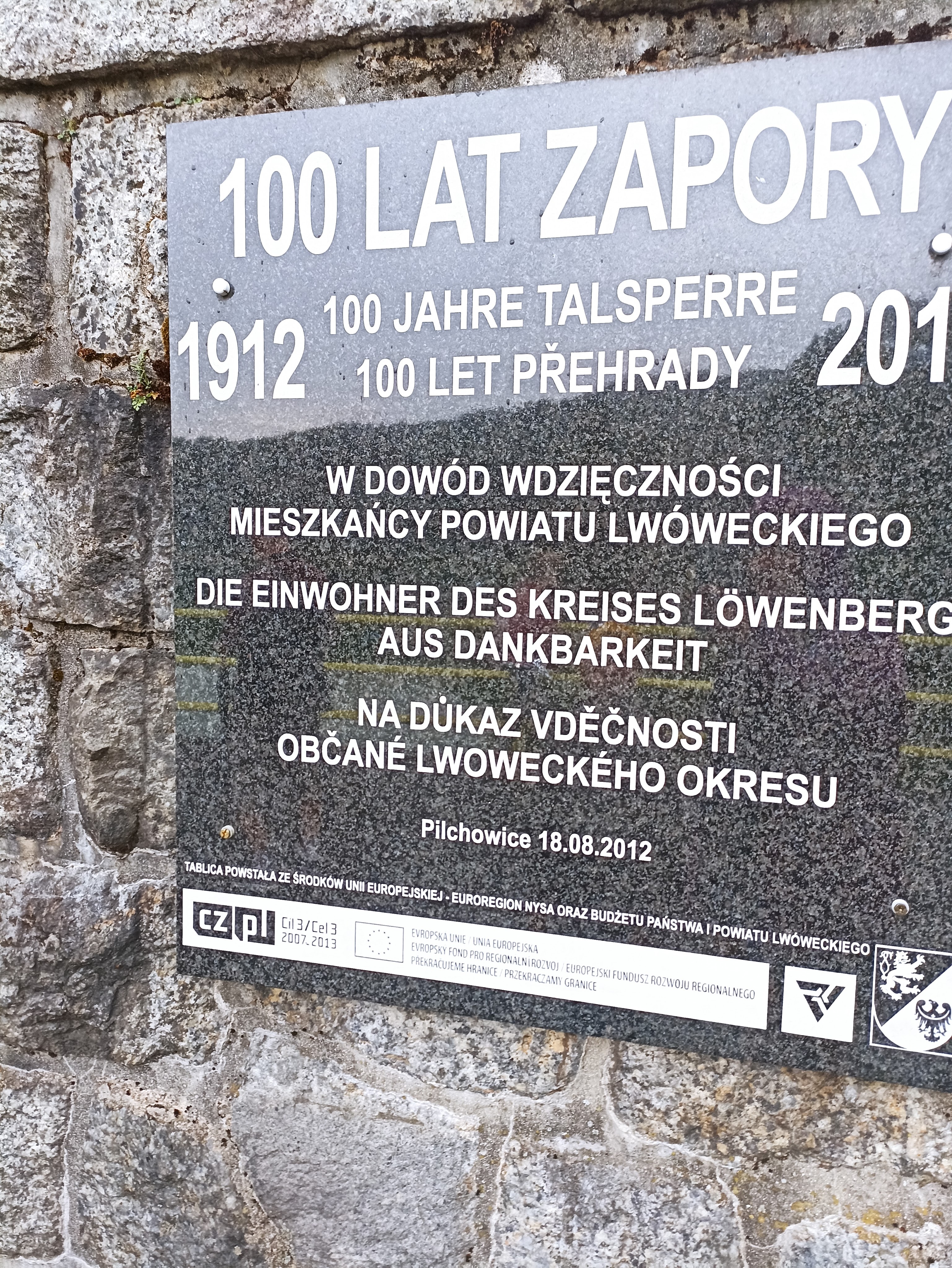 „To może skoczymy nad Zaporę Pilchowice? Spodoba się wam.” Jasne! Czemu nie? I tak wylądowaliśmy przy Zalewie Plichowickim (jak się dowiedzieliśmy przy okazji, w lokalnej świadomości funkcjonującym raczej jako Zalew P-i-lichowcki). Zapora z elektrownią wodną jest nieco większa od tej, którą oglądaliśmy wczoraj przy Zamku Czocha i prawie tak samo stara, bowiem powstała w 1912 roku.