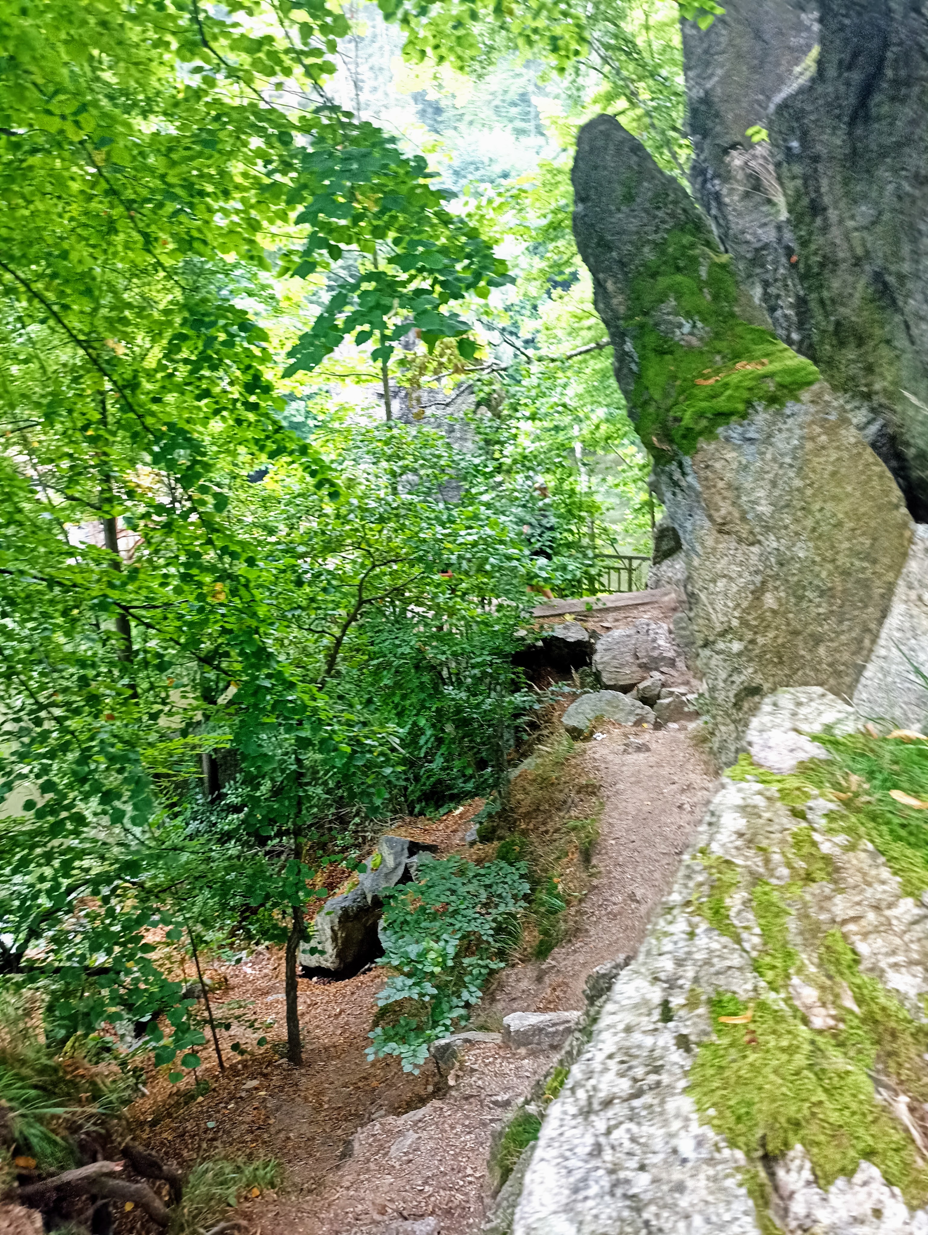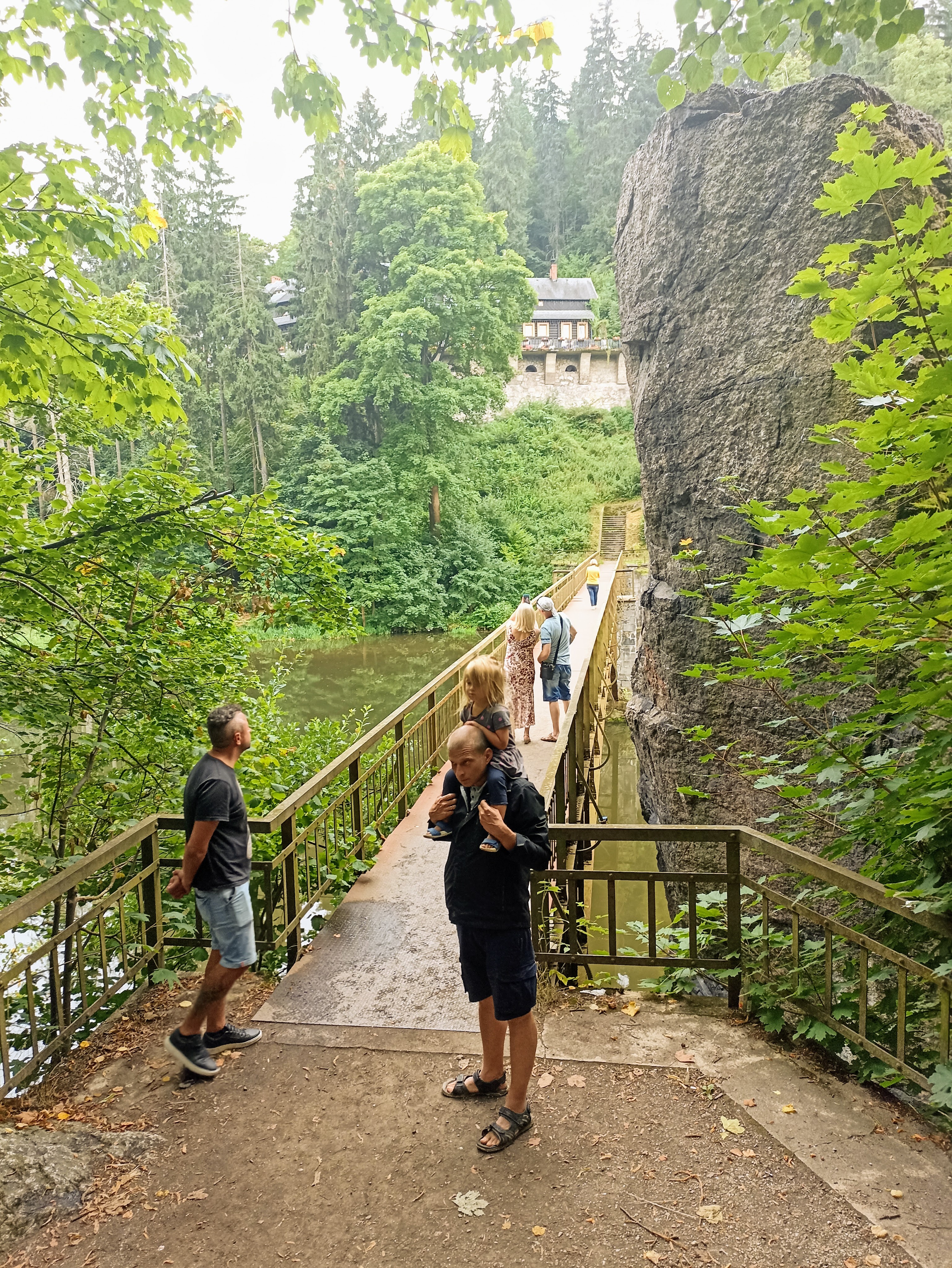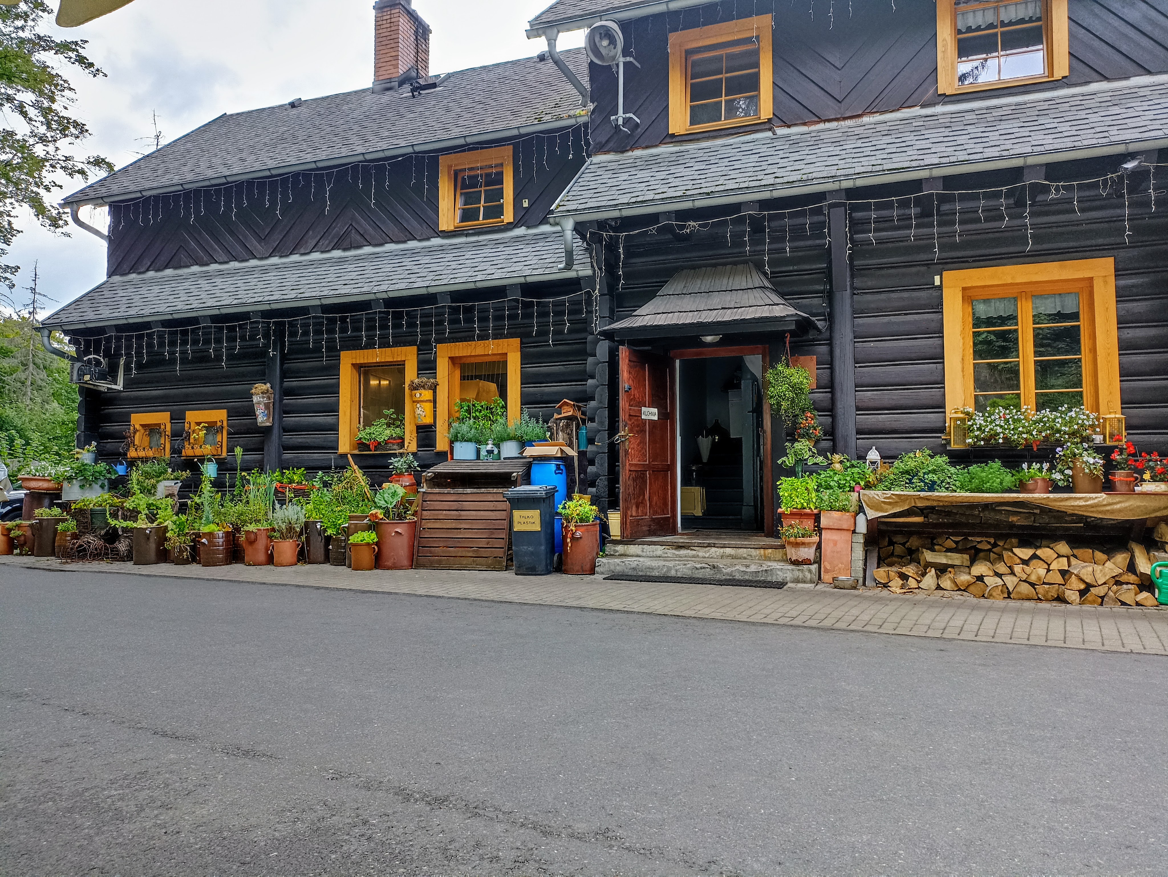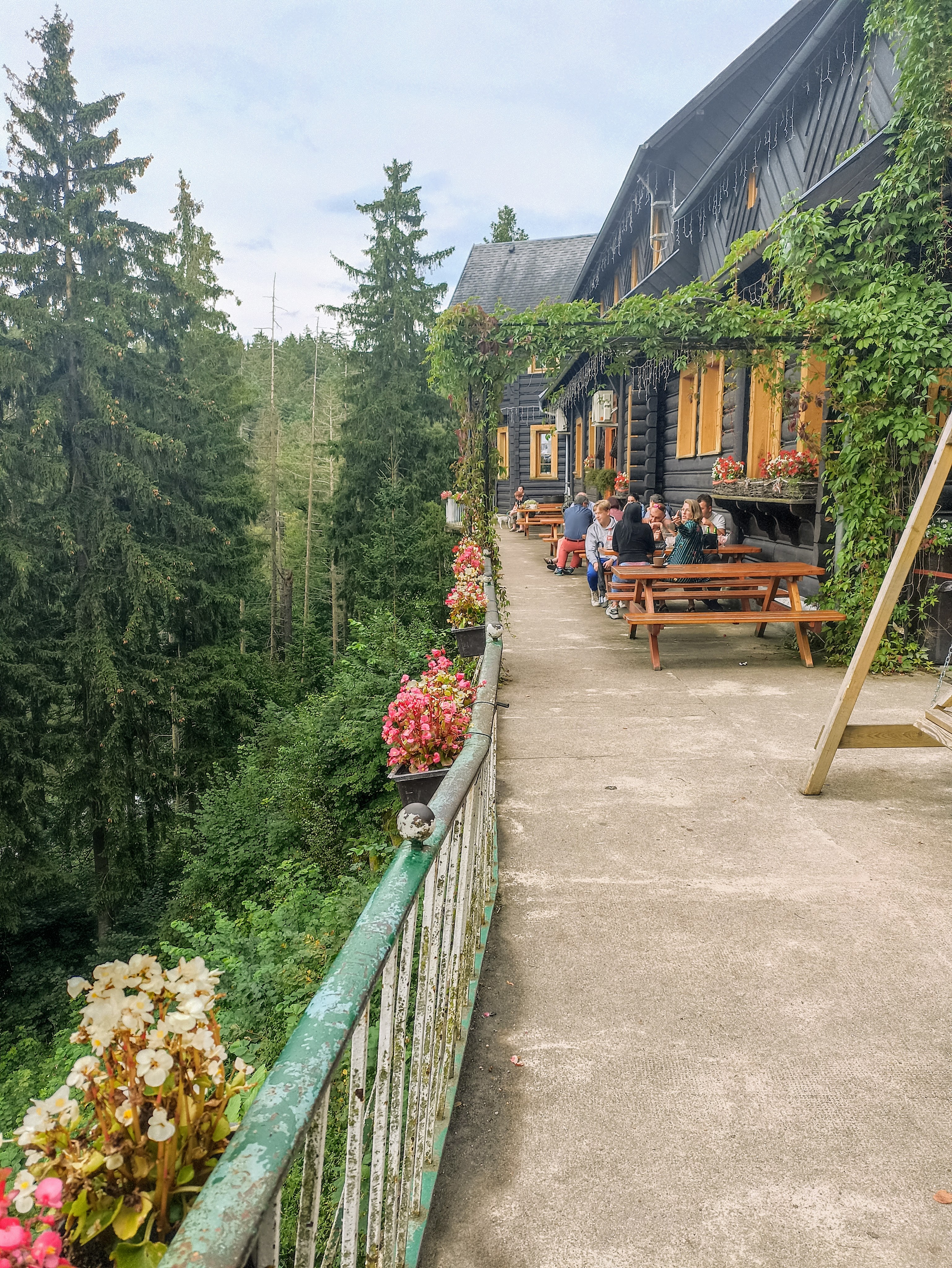 „To może jeszcze do Perły Zachodu”? I tak na deser (w właściwie na obiad;)) trafiliśmy do uroczego gościńca o nazwie „Perła Zachodu„. Schronisko powstało w 1927 roku i do 1945 funkcjonowało pod nazwą Turmsteinbaude. Jest malowniczo położone tuż nad krawędzią stromego urwiska. W dole znajduje się Jezioro Modre – kolejne zalewowe jezioro na rzece Bóbr. W okolicy jest dużo szlaków pieszych i rowerowych. Można stąd, idąc w górę rzeki spacerem, dotrzeć wprost do Jeleniej Góry.