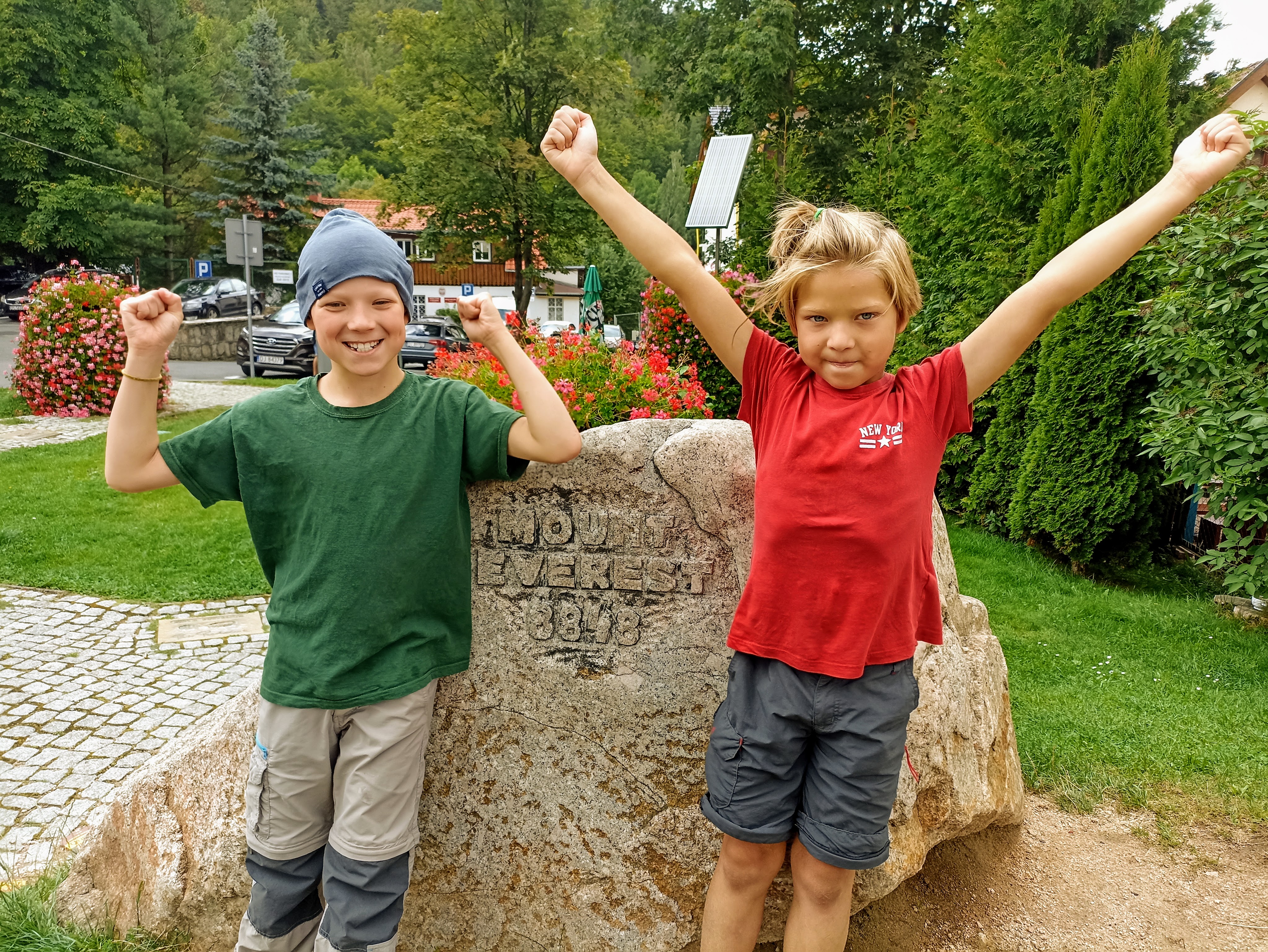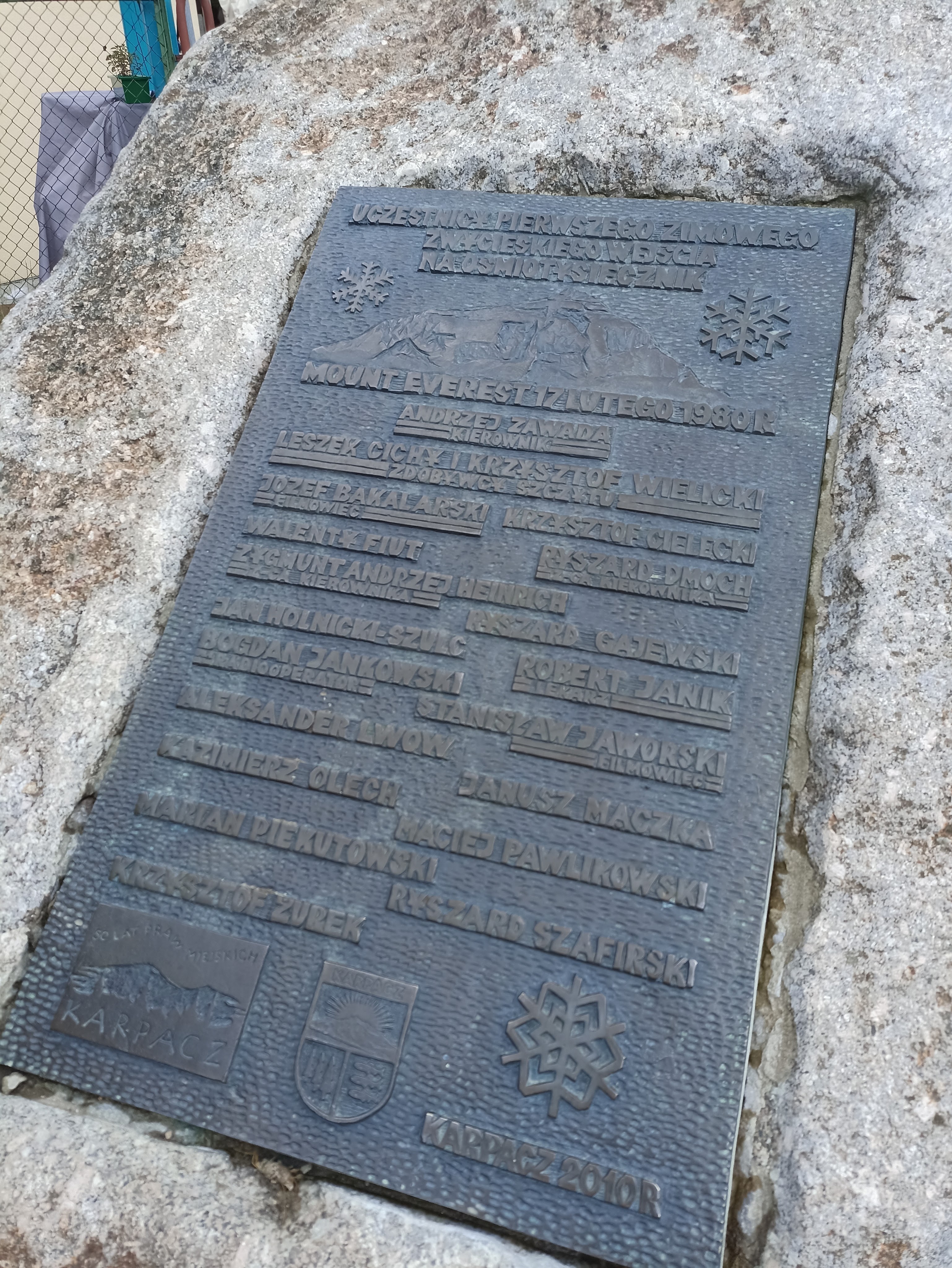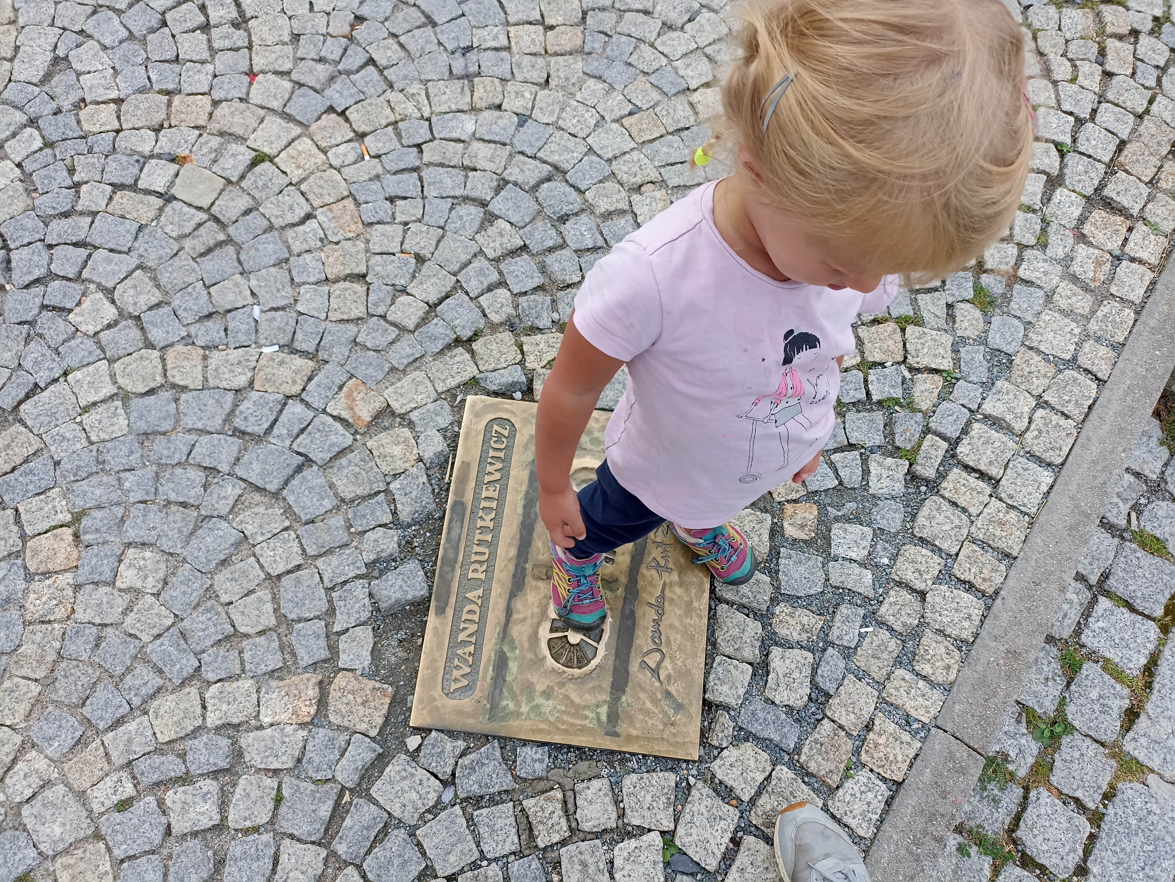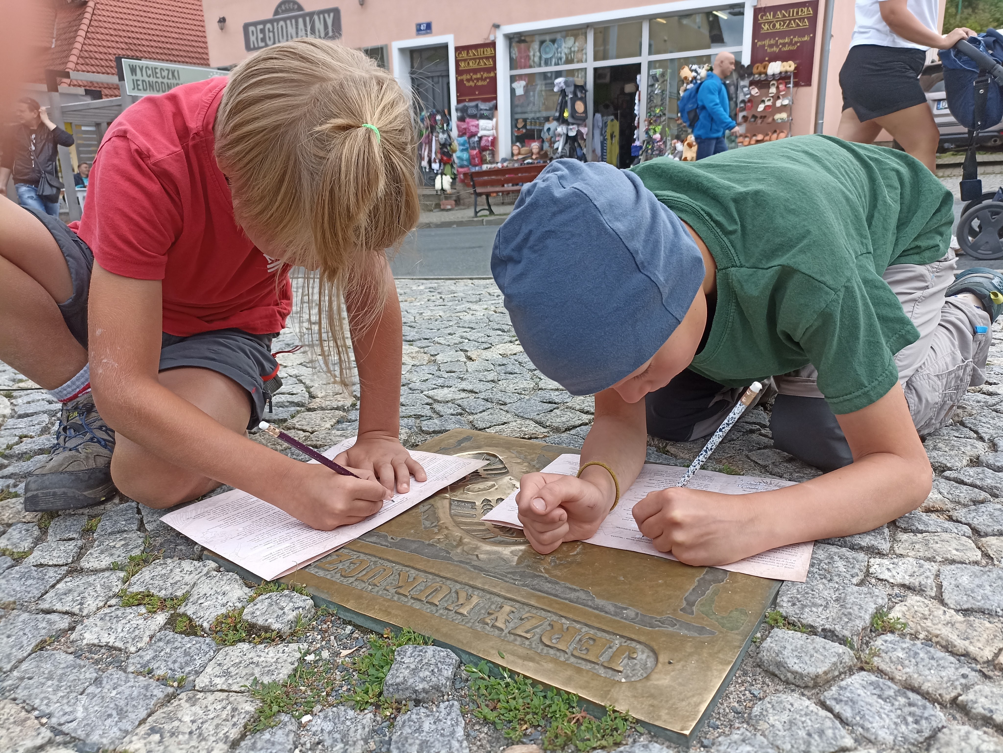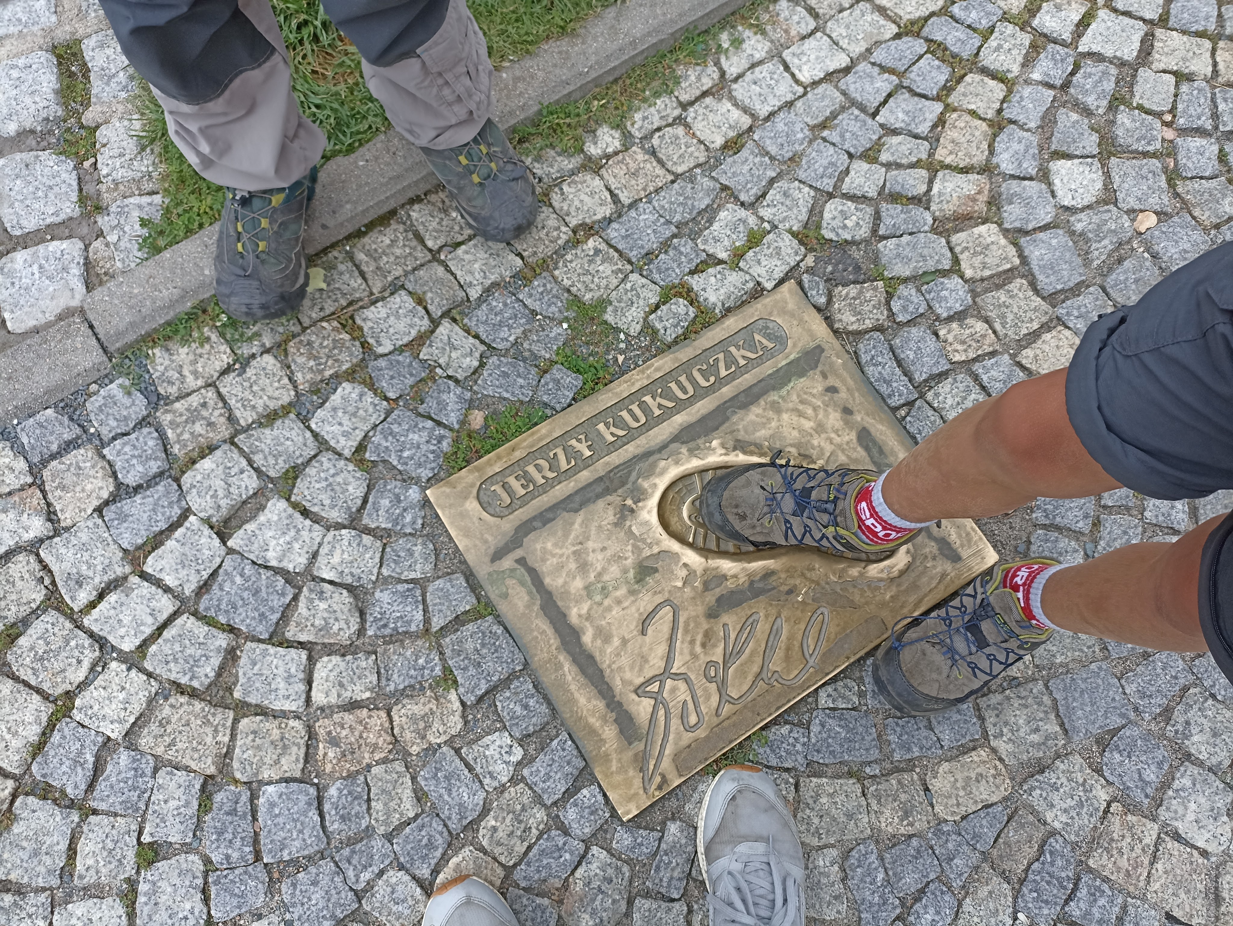 Gdy nieco się rozpogodziło, pojechaliśmy do Karpacza. Zaczęliśmy od Centrum Informacji Turystycznej. Można się tam wyposażyć w naprawdę spore ilości ulotek, bezpłatnych przewodników i map. Nam najbardziej zależało na materiałach do gry terenowej Zagadkowa podróż w Krainę Ducha Gór. Gdy je dostaliśmy, udaliśmy się na punkt startu, czyli na Skwer Śladów Zdobywców, w centrum Karpacza tuż przy głównym deptaku. Na skwerze odlane w brązie zostały ślady butów najsłynniejszych polskich himalaistów. Znaleźliśmy nam ślady m.in.. Macieja Berbeki, Jerzego Kukuczki, Wandy Rutkiewicz czy Krzysztofa Wielickiego.