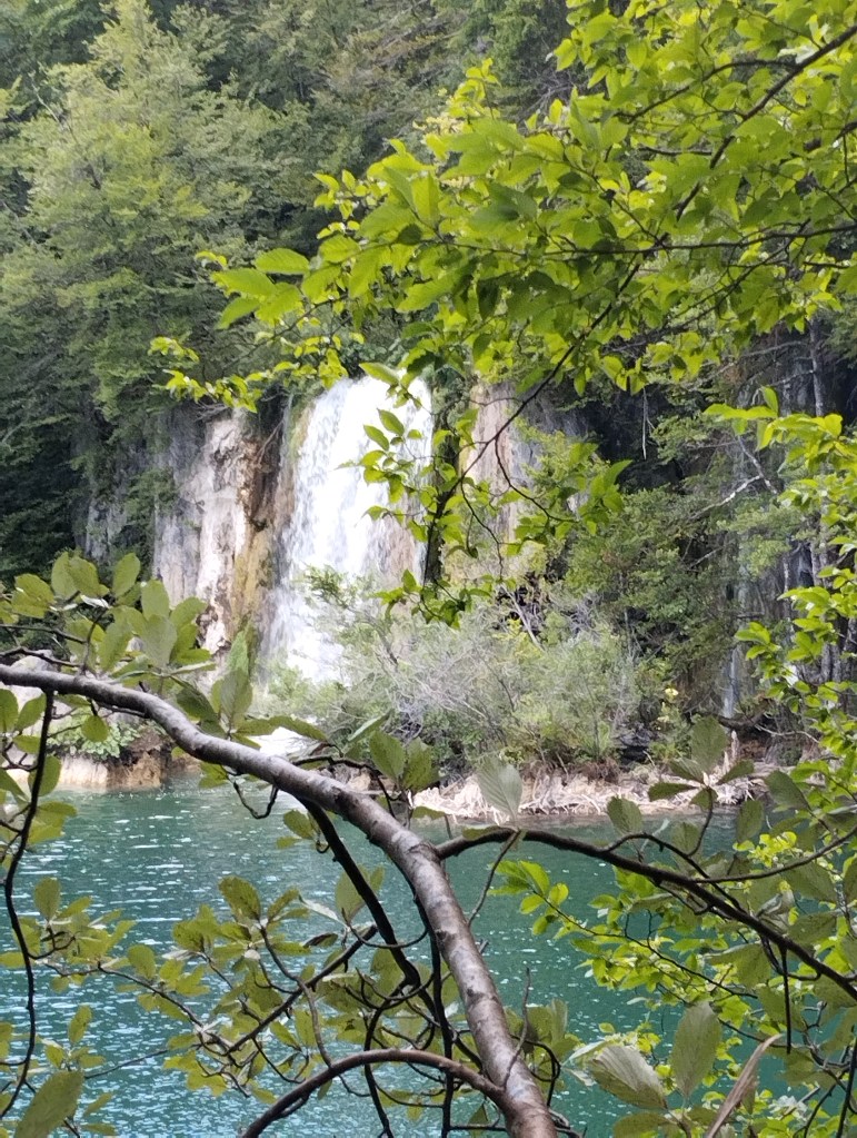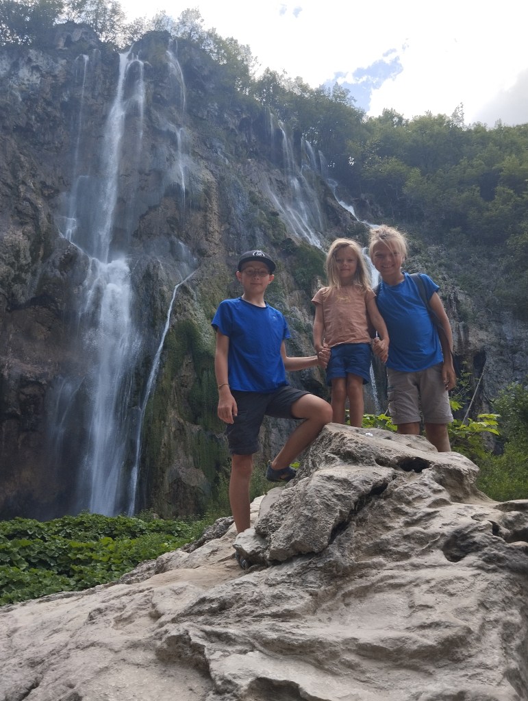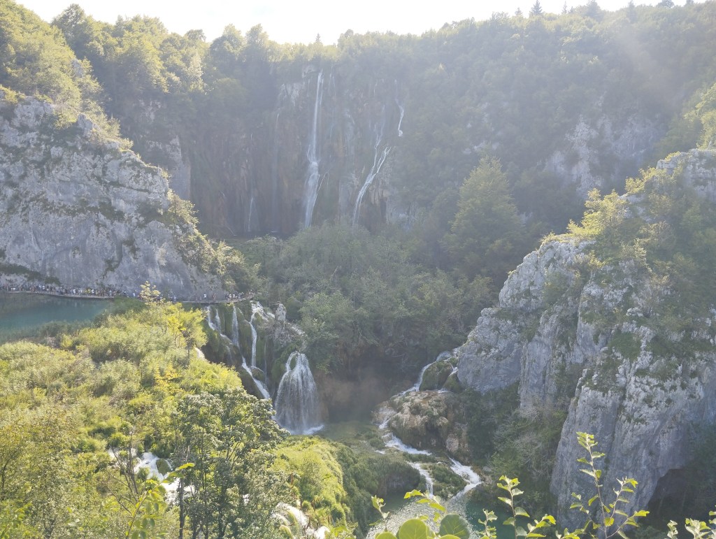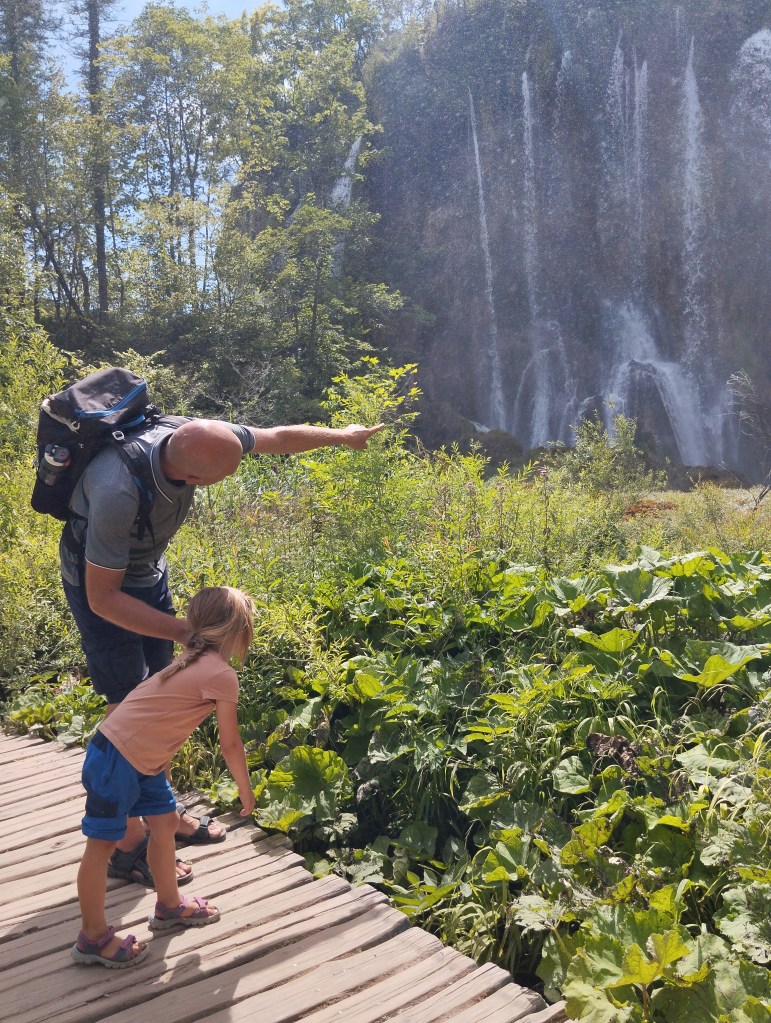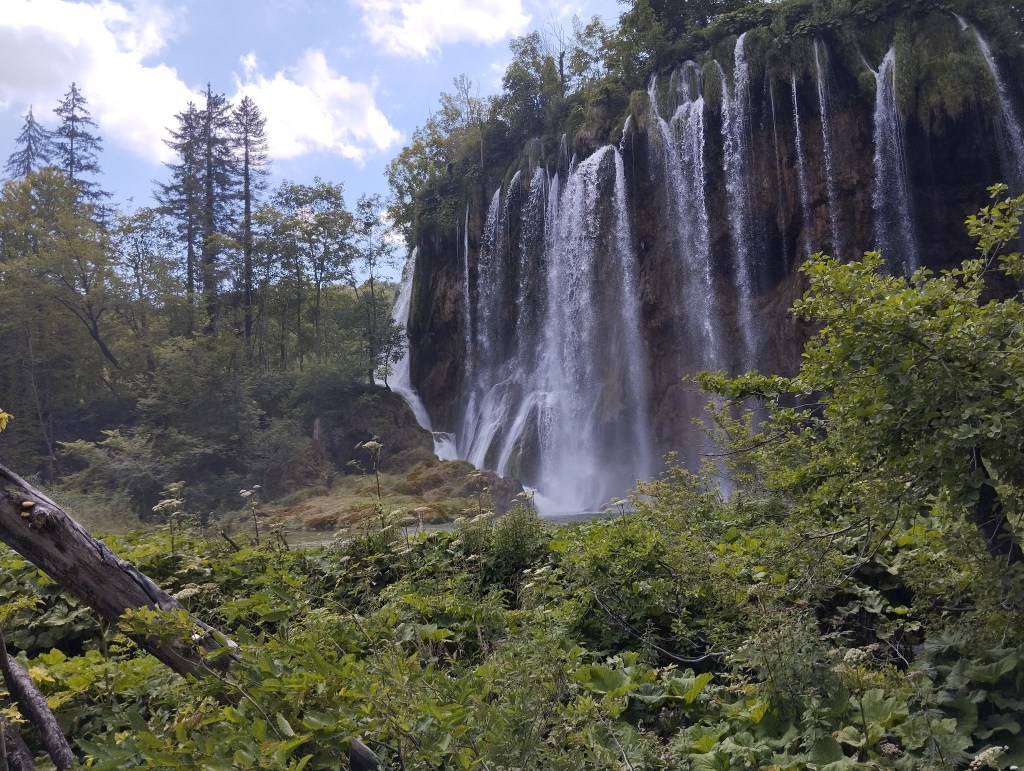 Do wielkiego wodospadu musieliśmy stać w regularnej kolejce na dobre kilkanaście minut! Ale w sumie było warto! Oczywiście lepiej byłoby przyjechać w mniej turystycznym terminie (podobno Plitwickie Jeziora wyglądają magicznie jesienią, gdy okoliczne lasy zmieniają kolor na pomarańczowo-czerwoną paletę), ale jesteśmy teraz i aż grzech byłoby tego nie zobaczyć.