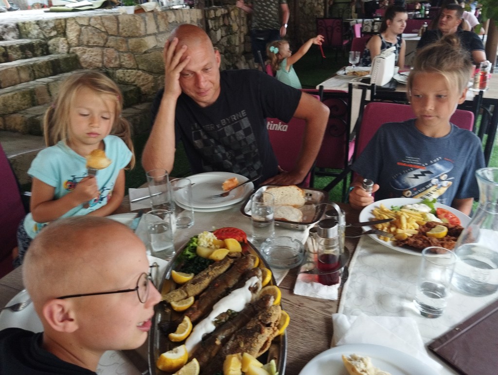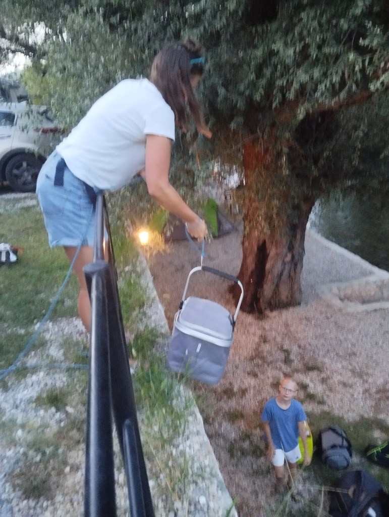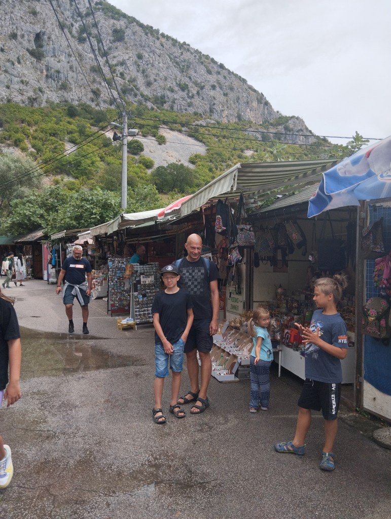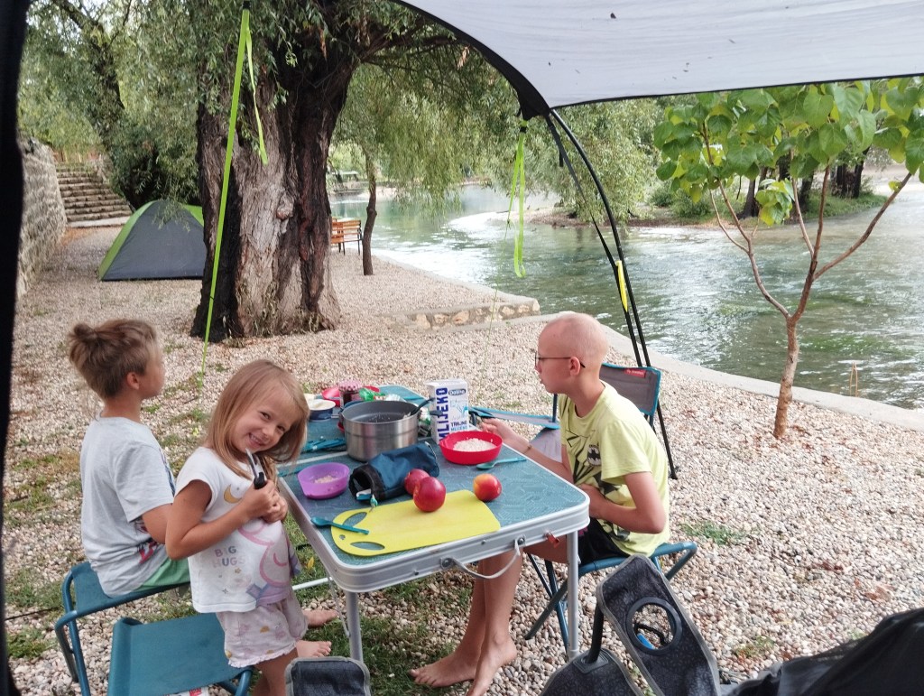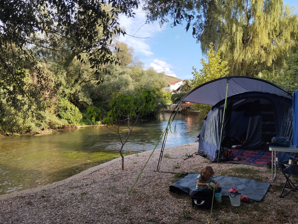 Za miejsce noclegu wybraliśmy Grotta Auto Camp, cudowny malutki kemping nad samą rzeką Buną. Kemping jest na tyle niepozorny, że najpierw w ogóle go nie zauważyliśmy! Miejsca jest tu może maksymalnie na kilka namiotów i ze trzy przyczepy. Wszystko na tarasach nad brzegiem rzeki. Ostatecznie orzeźwiający chłodek znad rzeki przekonuje nas do rozbicia się na najniższym piętrze, dosłownie metr od rzeki. Wiąże się to z małą ekwilibrystyką, bo samochód musimy zostawić „piętro wyżej” i całość naszych rzeczy znieść lub opuścić na linie. Oczywiście, ku uciesze chłopaków, którzy mają z tego niezłą radochę, wybieramy tę drugą opcję.