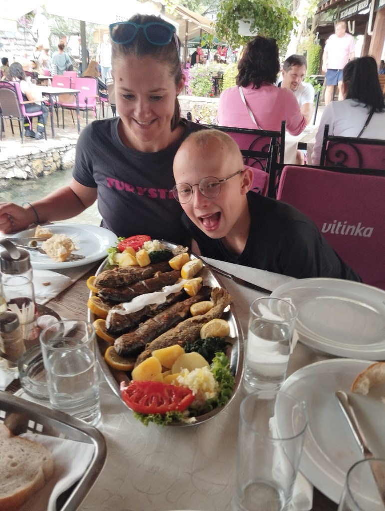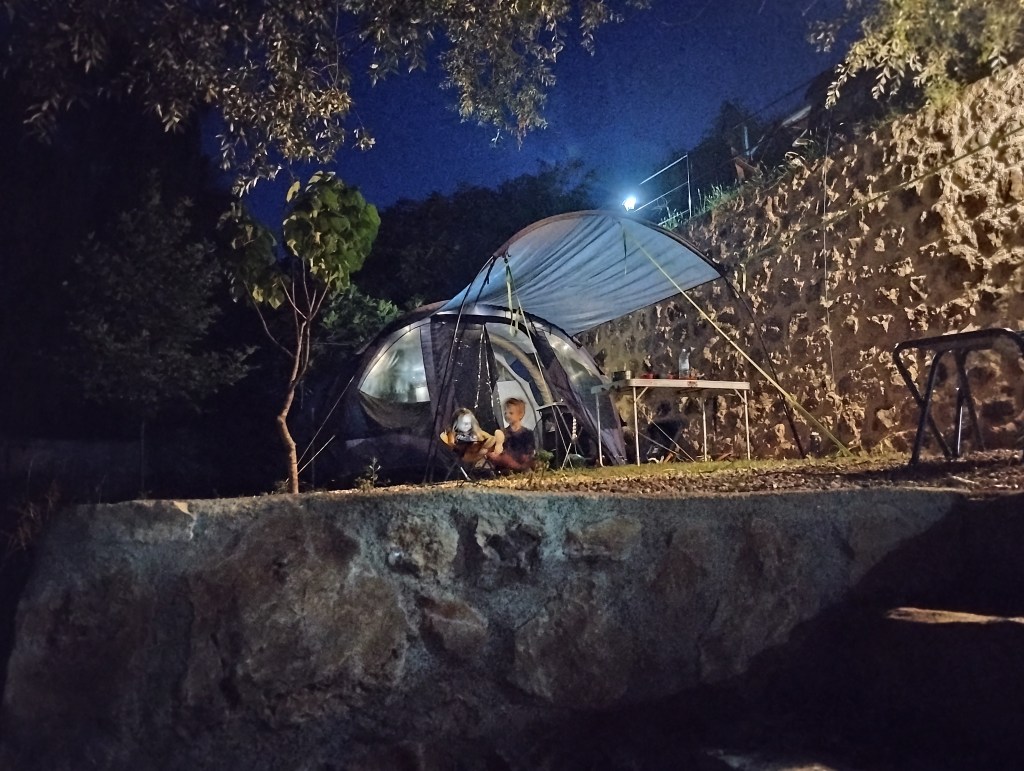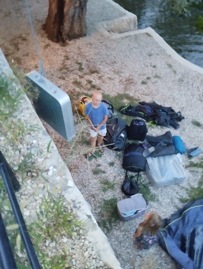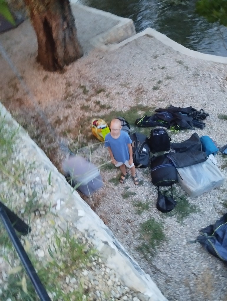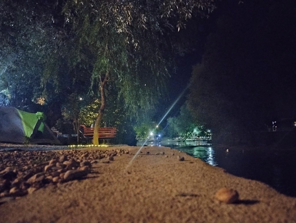 Za miejsce noclegu wybraliśmy Grotta Auto Camp, cudowny malutki kemping nad samą rzeką Buną. Kemping jest na tyle niepozorny, że najpierw w ogóle go nie zauważyliśmy! Miejsca jest tu może maksymalnie na kilka namiotów i ze trzy przyczepy. Wszystko na tarasach nad brzegiem rzeki. Ostatecznie orzeźwiający chłodek znad rzeki przekonuje nas do rozbicia się na najniższym piętrze, dosłownie metr od rzeki. Wiąże się to z małą ekwilibrystyką, bo samochód musimy zostawić „piętro wyżej” i całość naszych rzeczy znieść lub opuścić na linie. Oczywiście, ku uciesze chłopaków, którzy mają z tego niezłą radochę, wybieramy tę drugą opcję.