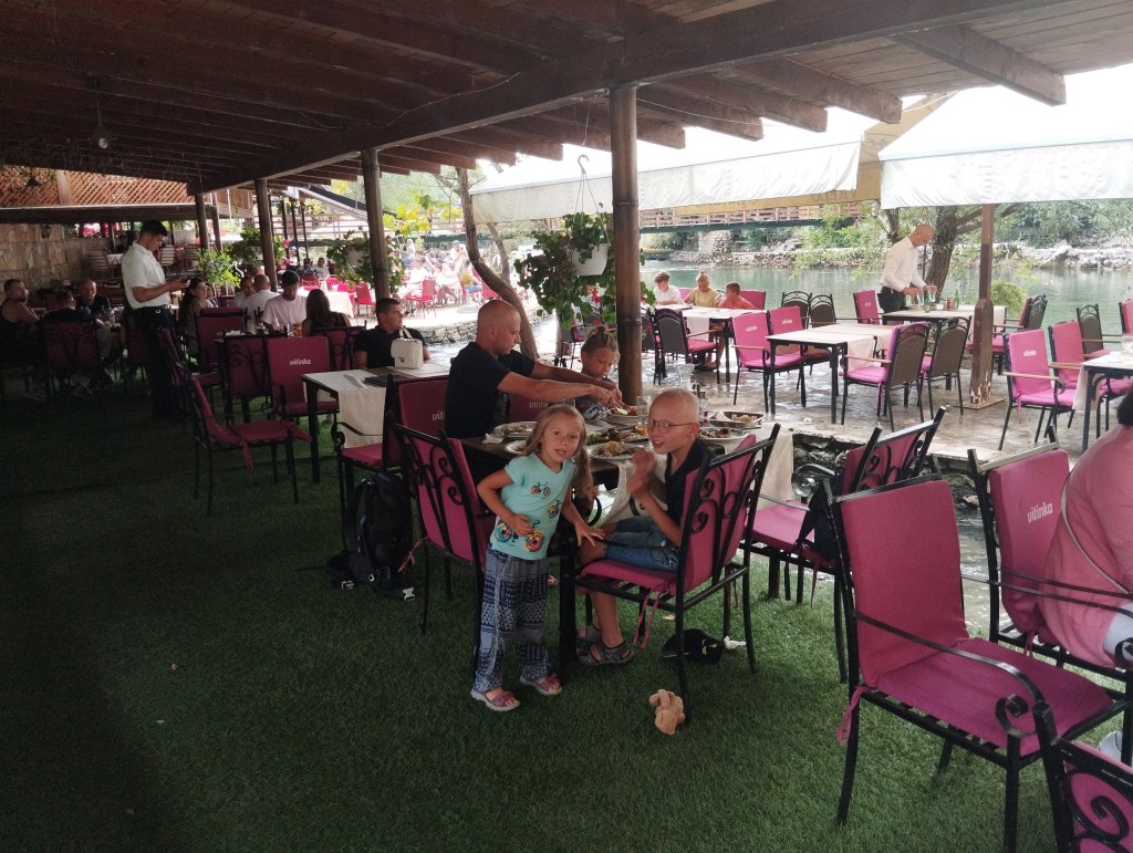 Blagaj wita nas pełnym folklorem, bo tuż obok w domu odbywa się impreza wydania przyszłej panny (takie pre-wesele). Jest bośniacka muzyka na ful. Przyszli weselnicy śpiewają, tańczą i skaczą do rzeki. Swoją radość również co chwilę wyrażają to w serii sztucznych ogni, to w serii… z kałasznikowa (!). Na szczęście strzelają w niebo, ale i tak czujemy, jakbyśmy się przenieśli do innego świata.