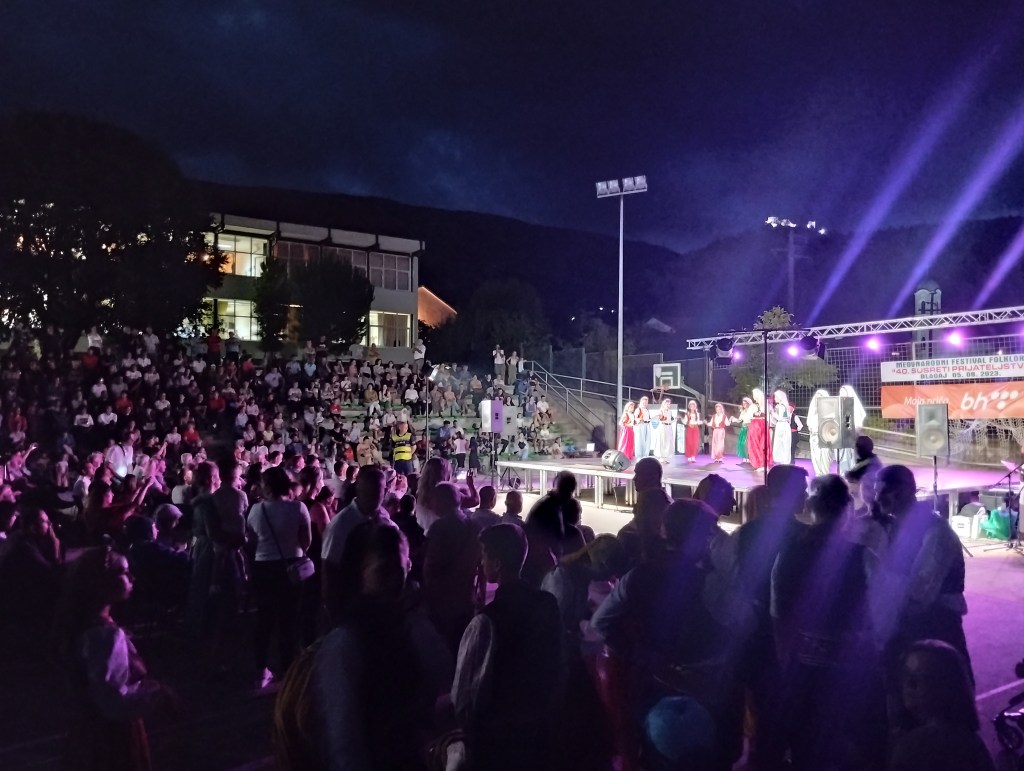 Przy okazji spaceru dowiedzieliśmy się, że wieczorem w naszej miejscowości odbywa się festiwal folkorystyczny. Oczywiście nie mogliśmy oprzeć się przed wybraniem się tam. I znowu pozytywne zaskoczenie. Myślałam, że to będzie taki festiwal „pod publiczkę”, dla turystów (w końcu jesteśmy w dość popularnym wśród turystów miejscu). A trafiliśmy na super święto dla lokalsów! Nie rozumiejąc niemal ani słowa (wszystko było po bośniacku), bawiliśmy się przednio tańcząc wraz tłumem Bośniaków do występów kolejnych zespołów – z Bośni, ale też Turcji czy Palestyny.