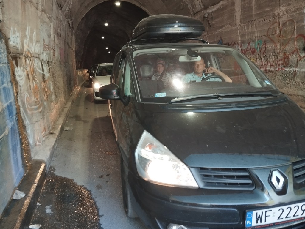 Po godzinie nastąpił RUCH. Nagle wszystkie pojazdy zaczęły, wjeżdżając w siebie nawzajem, manewr wyjazdu z parkingu. I tak powoli zaczęliśmy przesuwać się w kierunku promu. Ale nie bez przygód. „Terminal promowy” jest bardzo specyficzne położony – na bardzo małym obszarze skały, po drodze trzeba jeszcze minąć nieco prowizoryczny tunel (wykuty w litej skale) z informacją o spadających kamieniach u wjazdu. Samochody mijały się na centymetry. Nagle ktoś zaczynał w tym tunelu wycofywać, ktoś się z kimś kłócił. Bałagan niesamowity! A teoretycznie cały sztab ludzi do obsługi tego ruchu. Ale totalnie bez sensu zarządzany – stoimy w sznurze samochodów w korku w tunelu na jednokierunkowej i co kilka minut kolejna osoba przechodzi pytając się, czy mamy rezerwacje. My, że tak, a on, że „good, good, tickets onboard”. Na końcu tunelu jednak ktoś sprzedaje te bilety, a 2 metry dalej inny ktoś je sprawdza. Cyrk na kółkach! Cały przejazd (od parkingu do promu) trwał godzinę. W każdym cywilizowanym kraju trwałoby to około 3 minut. Trzeba dodać do tego jeszcze wjazd na prom – każdy z wjeżdżających ma obrócić samochód o 180 stopni, będąc już na promie (oczywiście na zawrotkę nie ma zbyt wielkiej przestrzeni) – dopiero po tym manewrze może zacząć parkować „na centymetry” tyłem.