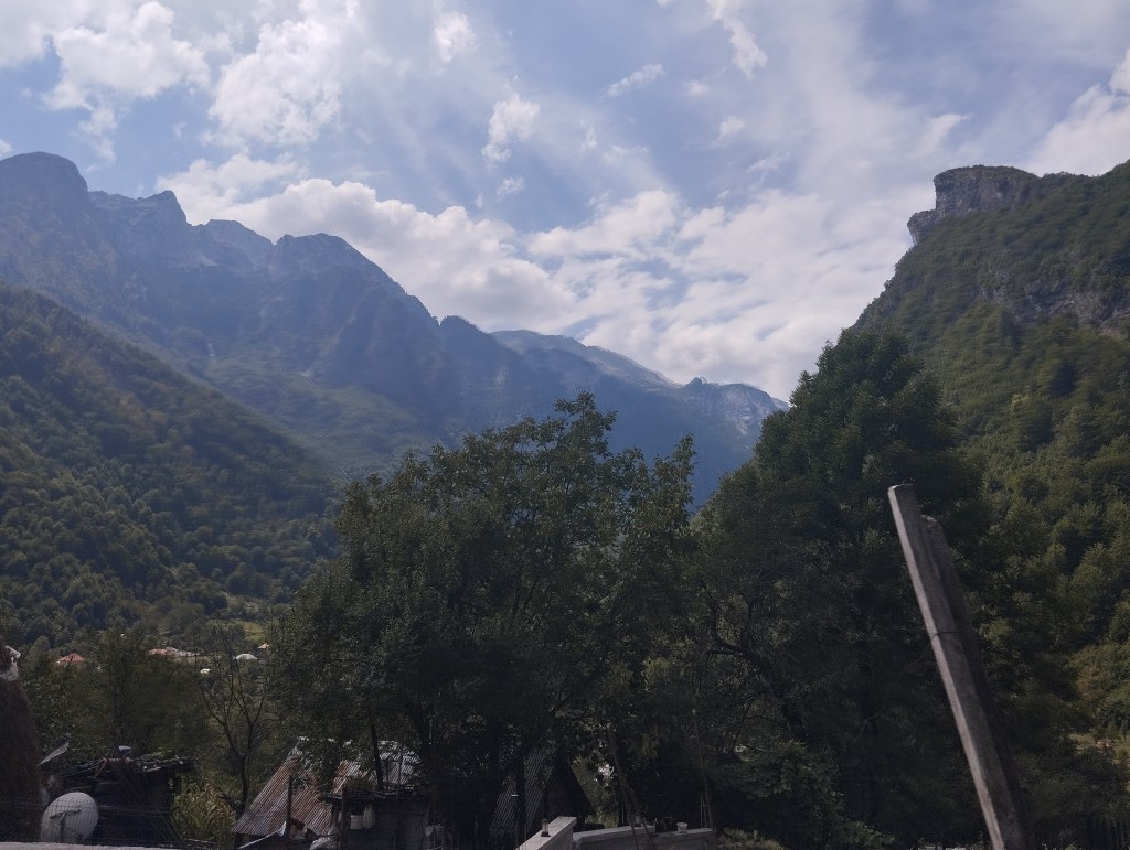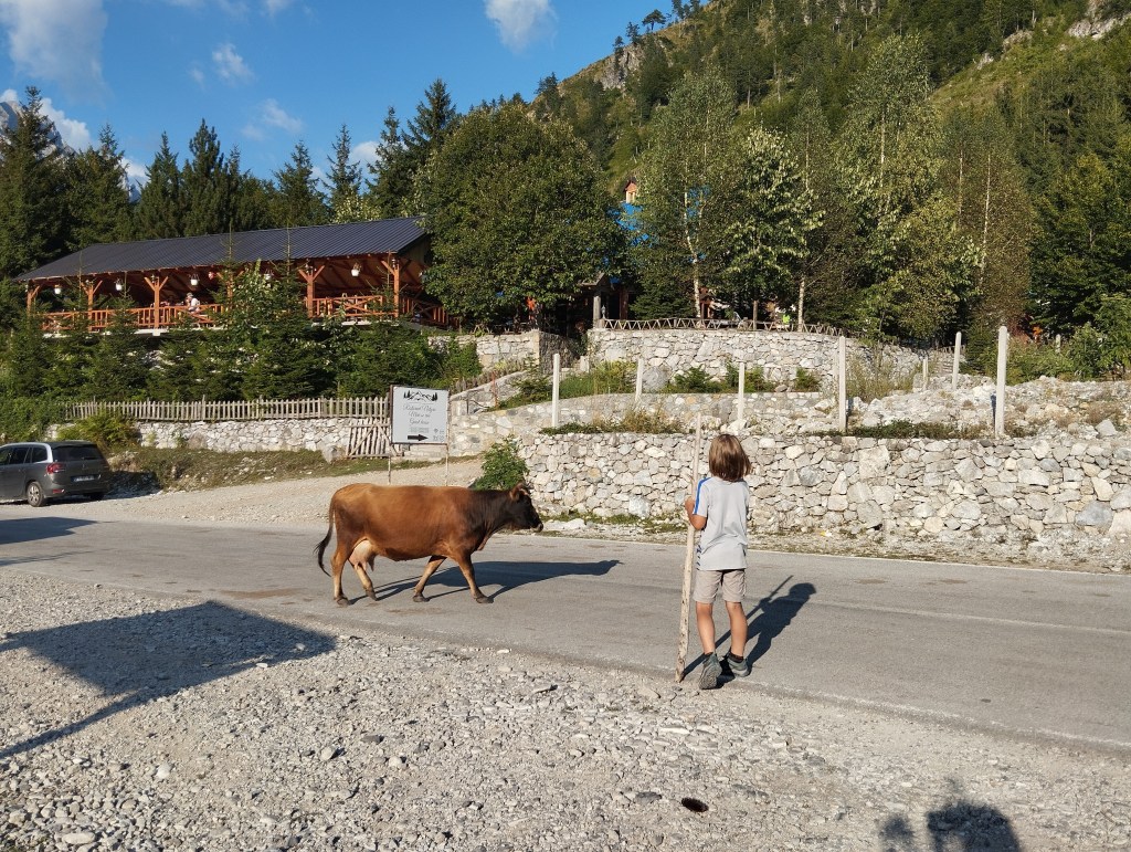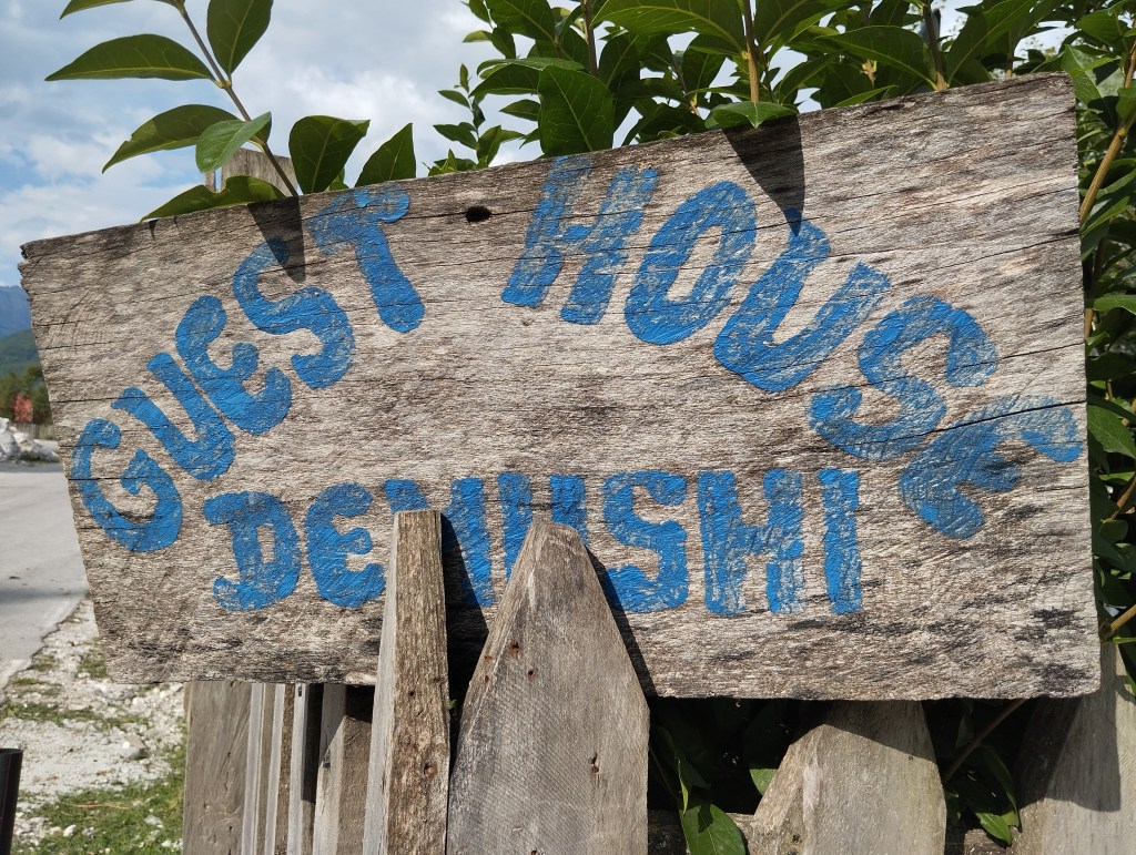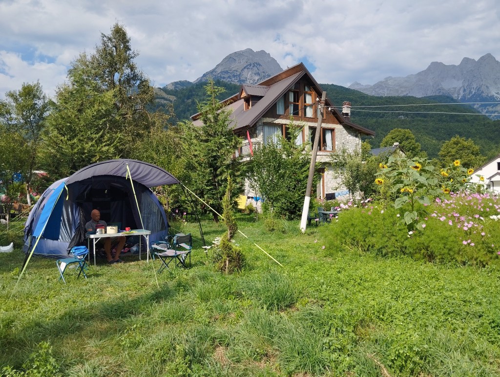 Nasz namiot stanął koło niewielkiego pensjonatu. Warunki kempingowe dość podstawowe, ale gospodyni bardzo gościnna i pomocna. Obok prowadzi mini sklepik z paroma produktami pierwszej potrzeby (jak lody i papierosy ;)) Ostatnie normalne sklepy zostawiliśmy ponad 25 km stąd w Bajram Curri. Tutaj jedynie jest parę punktów podobnych do tego prowadzonego przez naszą gospodynię oraz przez cały dzień kilka razy przejeżdża obwoźny sklep, czyli stary „taksówkarski” mercedes z otwartym bagażnikiem.