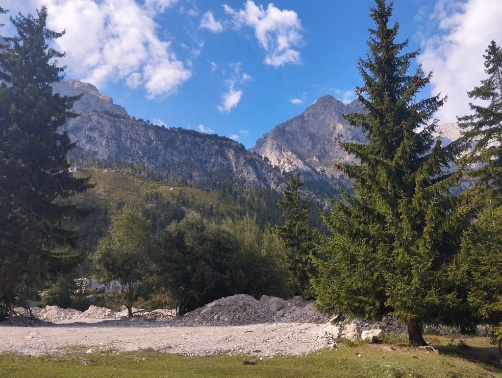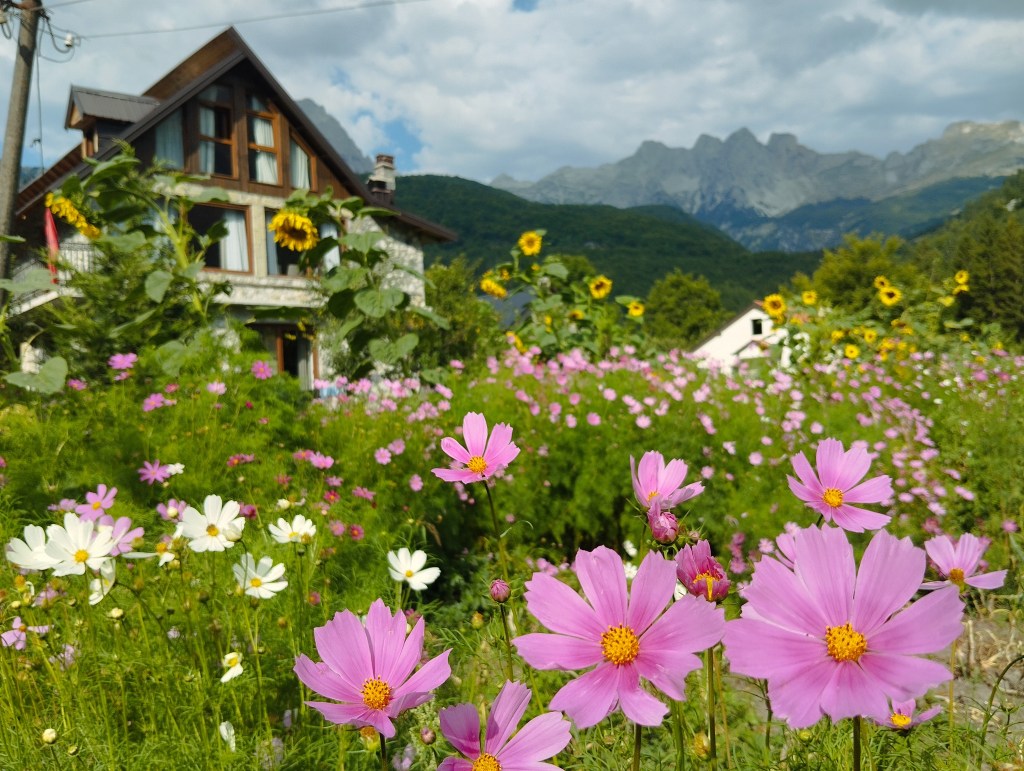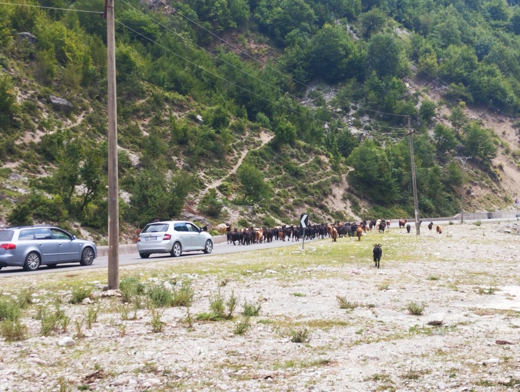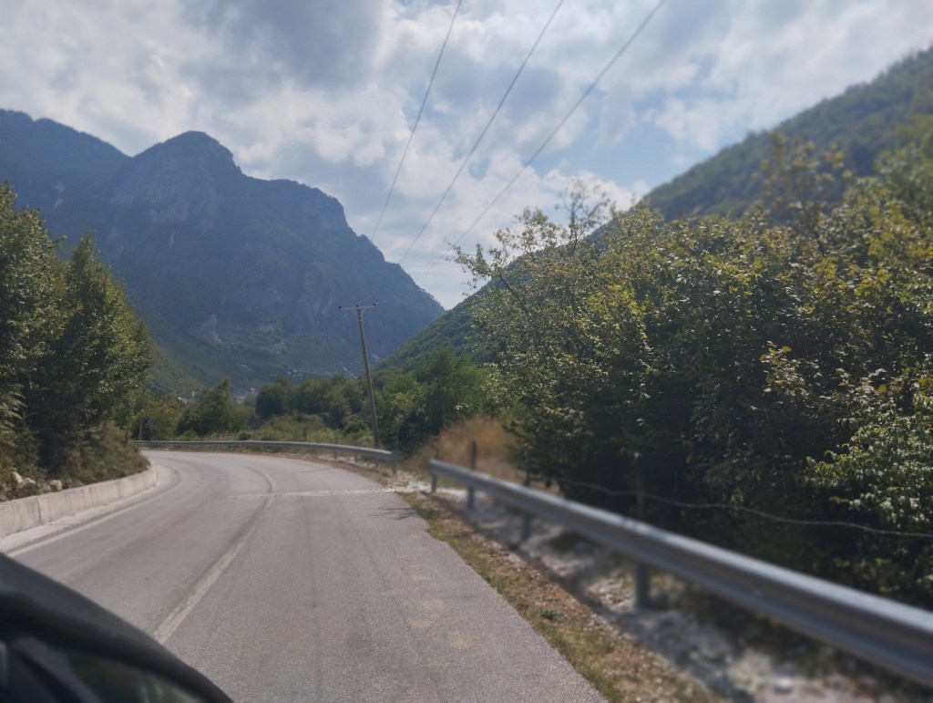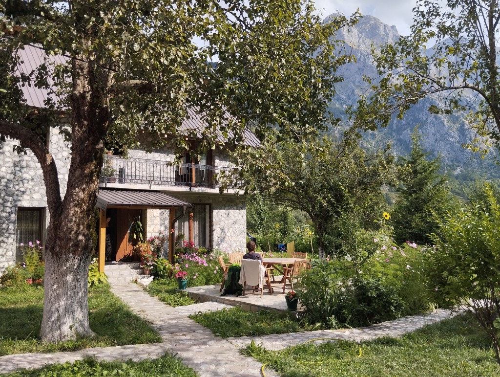 Nasz namiot stanął koło niewielkiego pensjonatu. Warunki kempingowe dość podstawowe, ale gospodyni bardzo gościnna i pomocna. Obok prowadzi mini sklepik z paroma produktami pierwszej potrzeby (jak lody i papierosy ;)) Ostatnie normalne sklepy zostawiliśmy ponad 25 km stąd w Bajram Curri. Tutaj jedynie jest parę punktów podobnych do tego prowadzonego przez naszą gospodynię oraz przez cały dzień kilka razy przejeżdża obwoźny sklep, czyli stary „taksówkarski” mercedes z otwartym bagażnikiem.