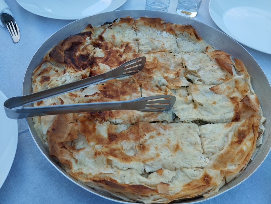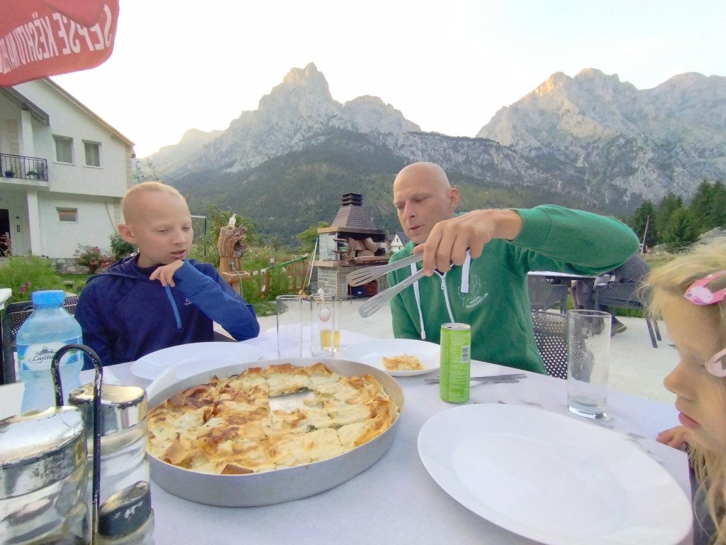 A wieczorem w lokalnej knajpce spróbowaliśmy kolejnej odsłony burka. I nie, nie chodzi tu o jakieś egzotyczne danie z bezdomnego psa (których zresztą na Bałkanach nie brakuje). Jest to rodzaj dużego zawijanego placka. A przynajmniej w Albanii spotkaliśmy się z taką formą. Wcześniej to samo danie było taką uliczną przekąską, coś ala nasza drożdżówka, tylko zawsze z wytrawnym nadzieniem – najczęściej z serem, ale też z mięsem czy warzywami. Nazwa pochodzi od tureckiego słowa bur oznaczającego: zawijać. Najpierw wyrabia się długo bardzo cienkie ciasto, które następnie jest nadziewane. Kupując burka na ulicy lub w sklepie czy piekarni, dostajemy już gotowy produkt. W restauracjach jest inaczej – naszego burka musieliśmy zamówić godzinę wcześniej. Poprosiliśmy o wersję najbardziej tradycyjną dla tego regionu, z białym serem i szpinakiem, który później okazał się jednak szczawiem lub czymś bardzo podobnym. Może kelner uznał nie zrozumiemy, czym się szczaw i zastosował taki wybieg z bardziej „znanym” szpinakiem. Widać, że nie znają tu naszej szczawiowej 😉